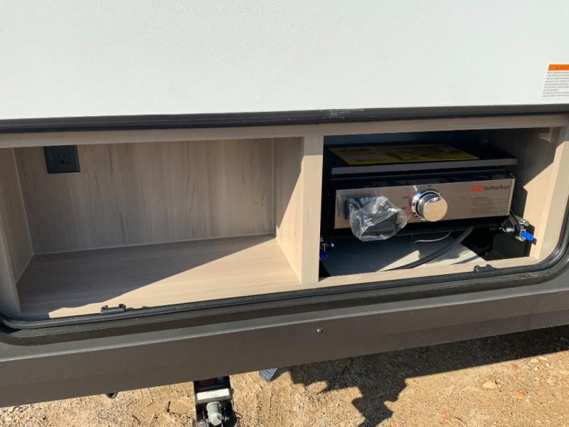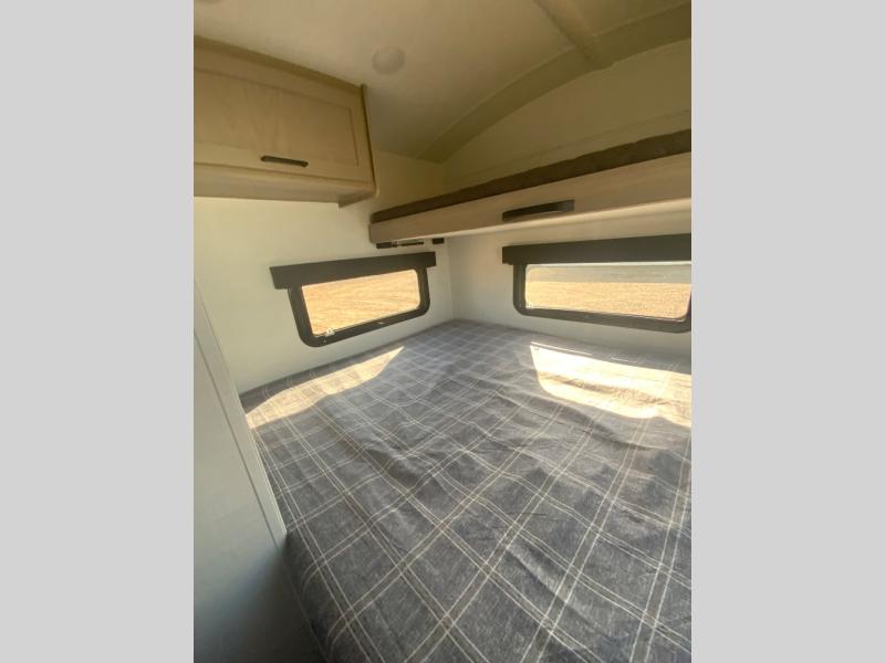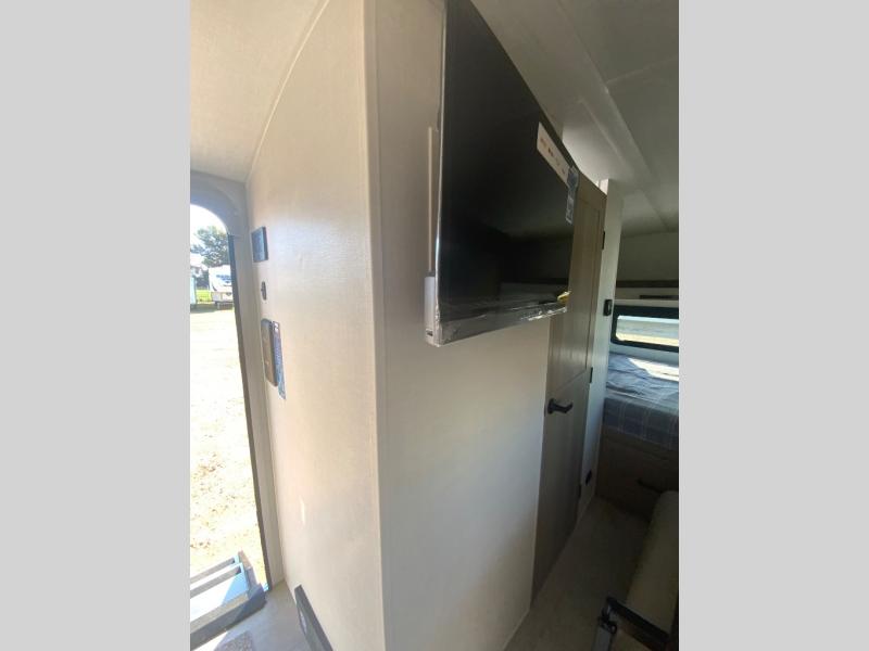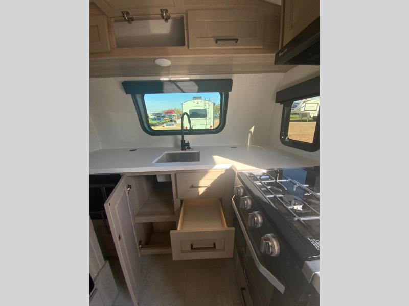 Are you looking for a lightweight trailer with at-home comforts? Take a look at this single slide out unit that can sleep three to four each night. There is a queen-size bed in the back with a 26" x 80" flip-up bunk for cozy sleeping space, a 72" sofa with cupholders to relax on, plus a 12V TV for movie nights! The front kitchen includes a 12V refrigerator to store food, plus a microwave oven and a gas oven to cook meals each day.