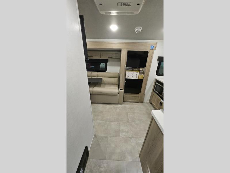 Are you looking for a lightweight trailer with at-home comforts? Take a look at this single slide out unit that can sleep three to four each night. There is a queen-size bed in the back with a 26" x 80" flip-up bunk for cozy sleeping space, a 72" sofa with cupholders to relax on, plus a 12V TV for movie nights! The front kitchen includes a 12V refrigerator to store food, plus a microwave oven and a gas oven to cook meals each day.