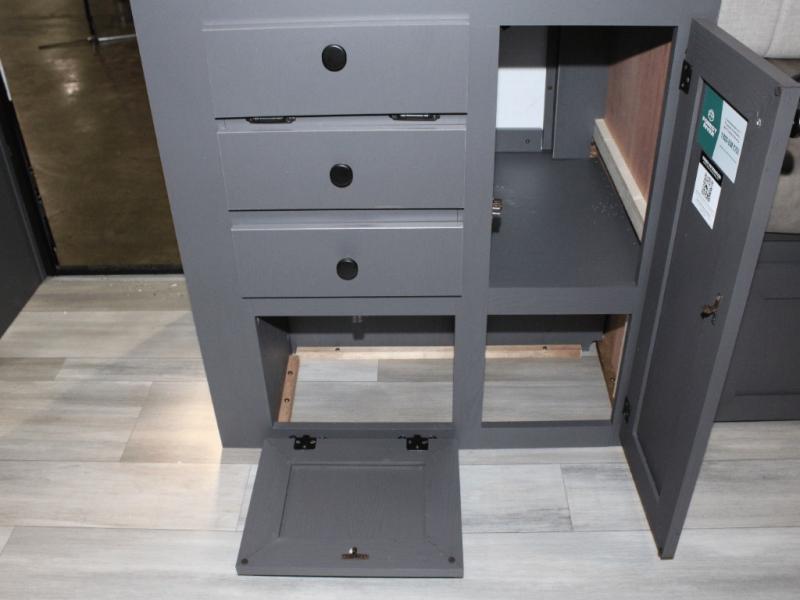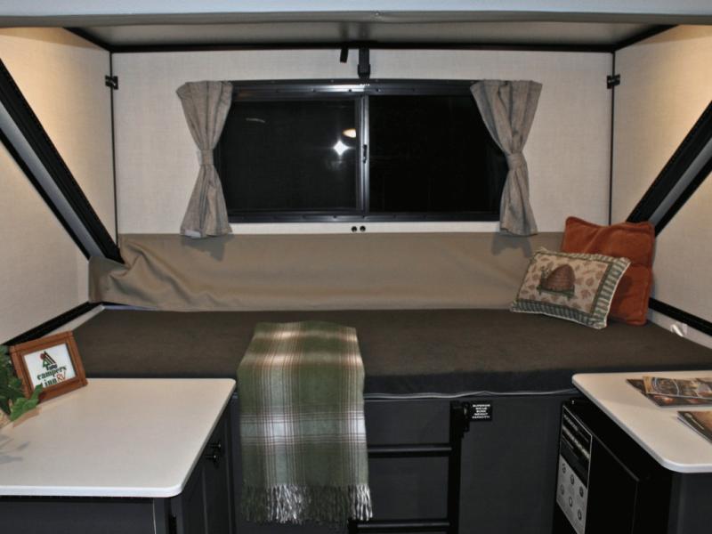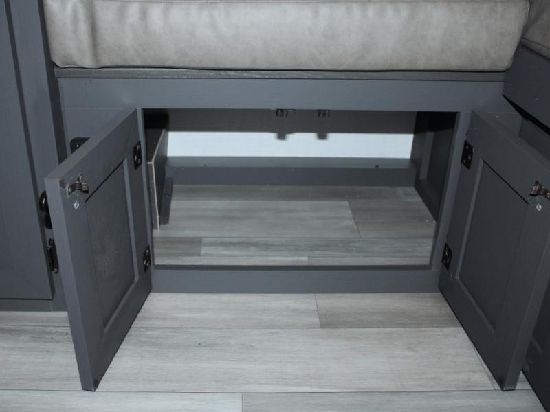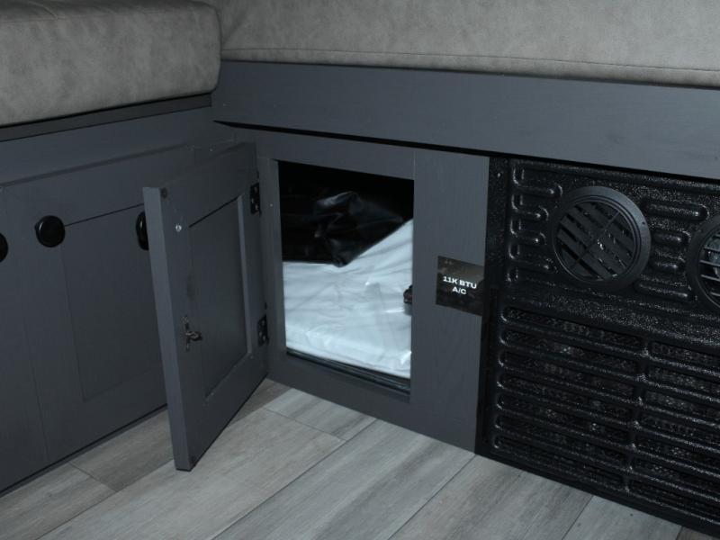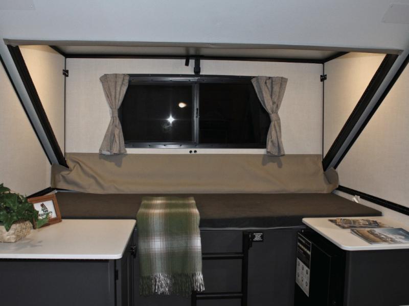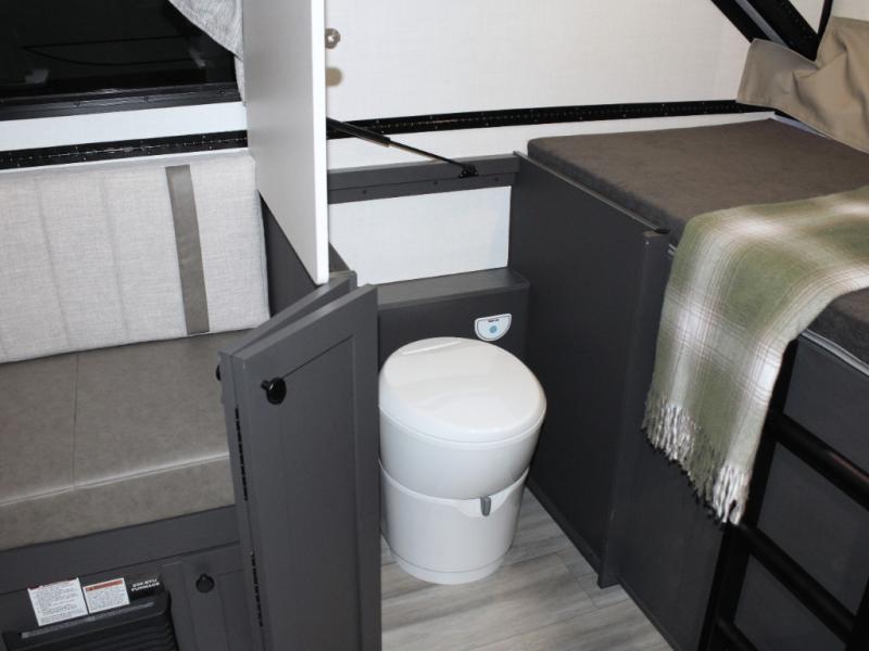 This model adds everyday convenience with a built-in toilet, so you won’t need late-night trips to campground facilities. The dormer enhances headroom and natural light, creating an open, airy interior feel. A refrigerator keeps snacks and drinks fresh, while the bunk bed provides additional sleeping space for kids or guests, making this camper ideal for families. Outside, generous pass-thru exterior storage offers plenty of room for outdoor gear, toys, and travel essentials.