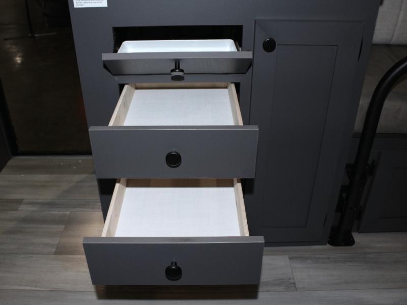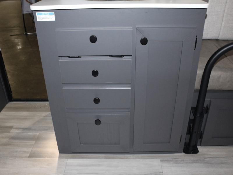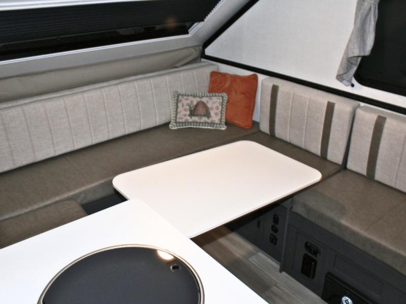 Inside, the inviting gaucho bed creates a comfortable retreat for lounging, reading, or getting a great night’s sleep. The convertible table seamlessly transitions from a dining area to a workspace or game table, making it perfect for meals, planning, or family fun. Stay cool even during summer trips with the under-bunk air conditioner, strategically placed for maximum comfort.