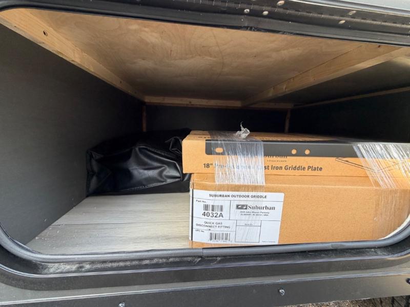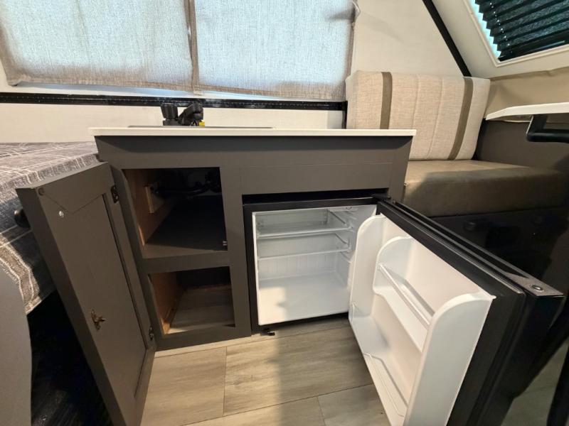 You'll love taking this camper to different campgrounds all summer long! Since there is a 54" x 80" flip-up bed, you won't have to sleep on an air mattress, and there is a front 33" x 80" booth dinette for dining space. An extra guest or two little ones could even use this space to sleep on at night! An exterior griddle provides a way to cook meals each day, and the 12V refrigerator will keep your cold items fresh. You'll also appreciate the front EZ Reach storage trunk for tools, hiking gear, and more!