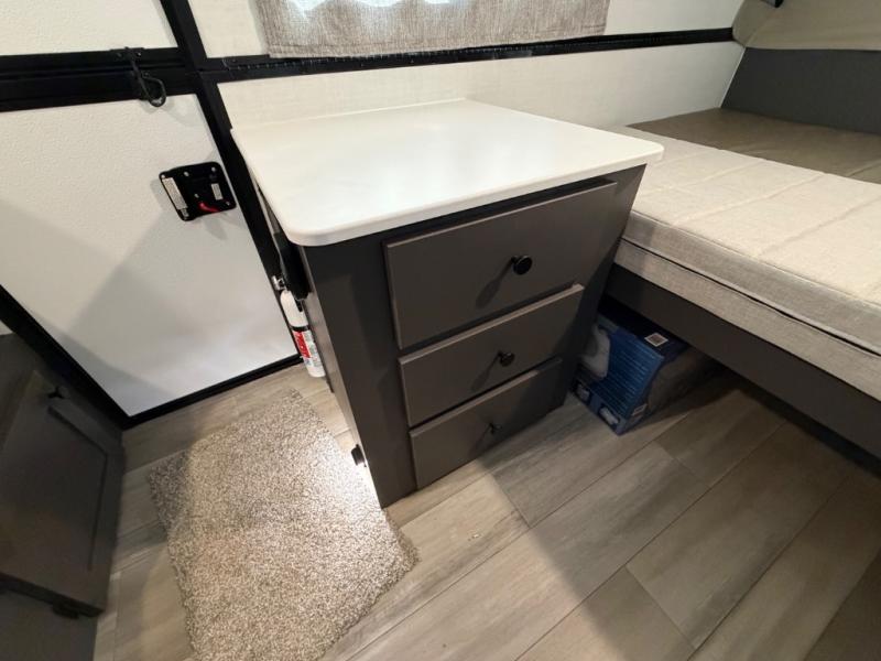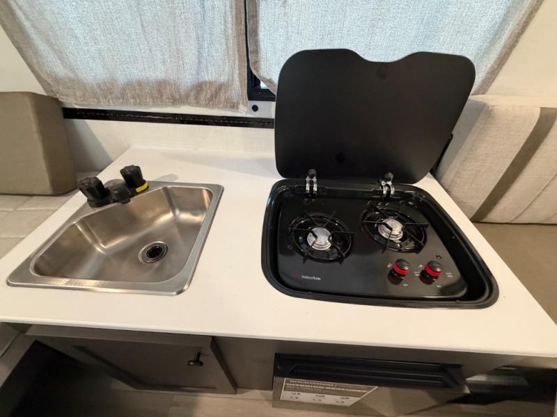 Time spent in this camper will be time well spent! You can sleep each night on the 54" x 80" gaucho bed, and the booth dinette can double as both dining and sleeping space. There is also a two-burner range that can be used to fry up a hearty batch of pancakes without even starting a fire, and the 12V refrigerator will be perfect for your perishables. There are also front and rear dormers to give you more space!
