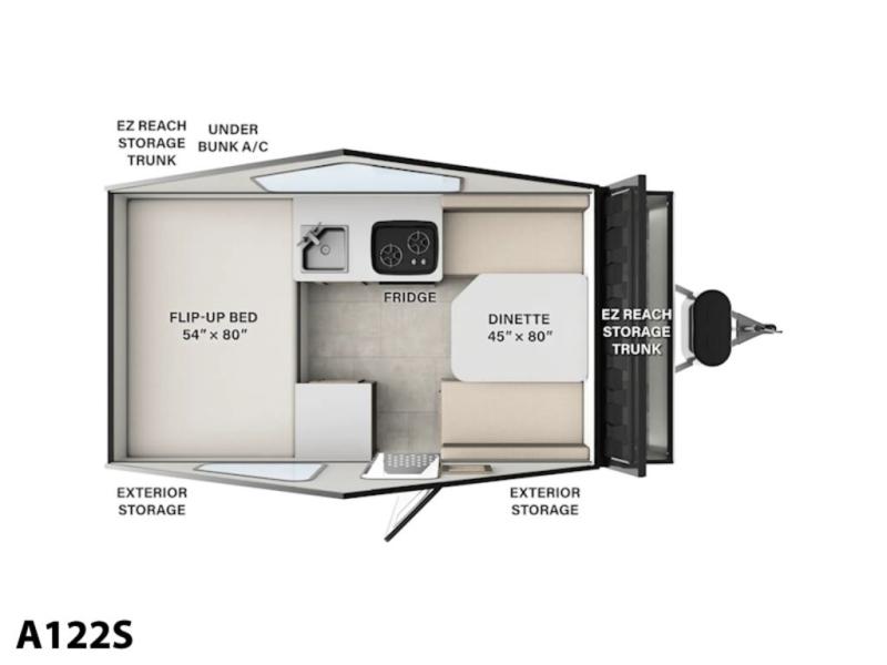 You can be set up at the lake in no time with this A-frame camper! The flip-up bed will provide more storage space for your bags, and you can relax with a cold drink at the 45" x 80" booth dinette once you're unpacked. There is a two-burner cooktop and a 12V refrigerator with a 100W roof solar panel to cook and store meals each day. This model includes tons of exterior storage, including two EZ reach storage trunks and additional exterior storage for all your camp gear!