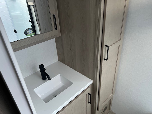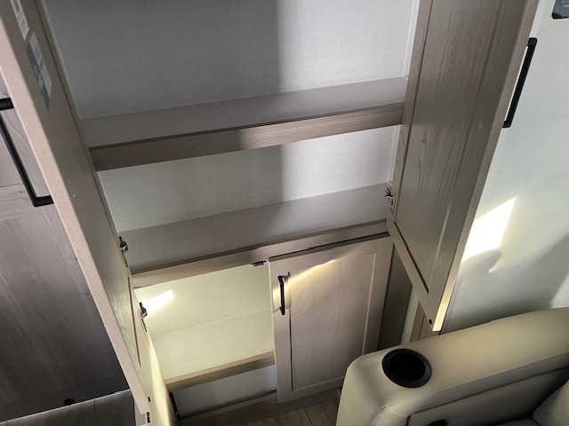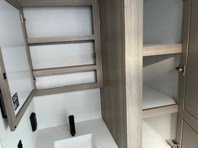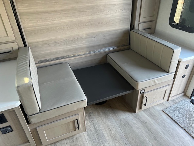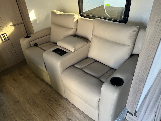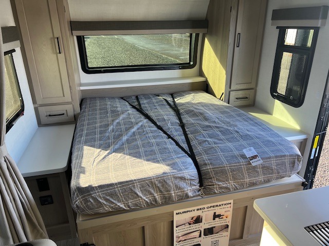 This versatile travel trailer is perfect for weekend camping trips to your favorite park! Once you arrive at your site, you can unload the pass-thru storage, then put out the 15' power awning and relax in your camp chairs. The cooktop and microwave inside will let you make lunch when you get hungry, and there is a theater seat slide out if you want a comfy place to relax. There is also a 30" x 80" booth dinette up front where you can dine together and play games in the evenings, and when you're ready for bed, the 60" x 74" Murphy bed can be folded down over the dinette. This unit includes plenty of storage spaces, including dual bedside wardrobes, a kitchen pantry, and a linen closet in the full rear bath!