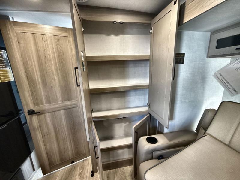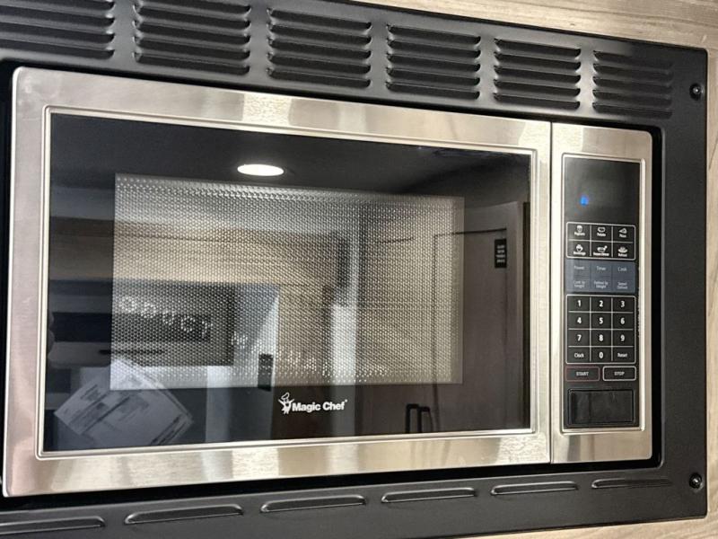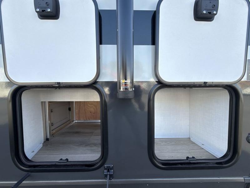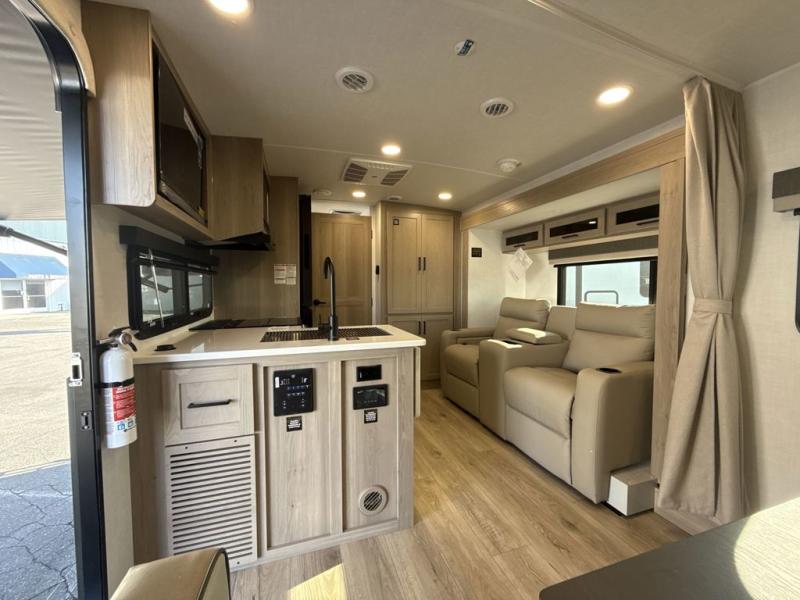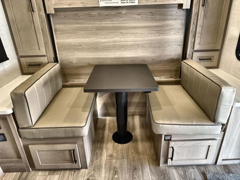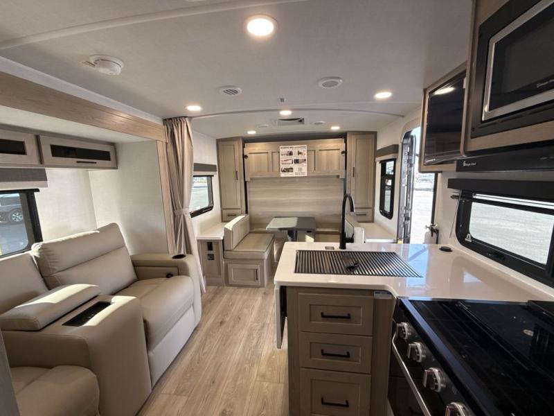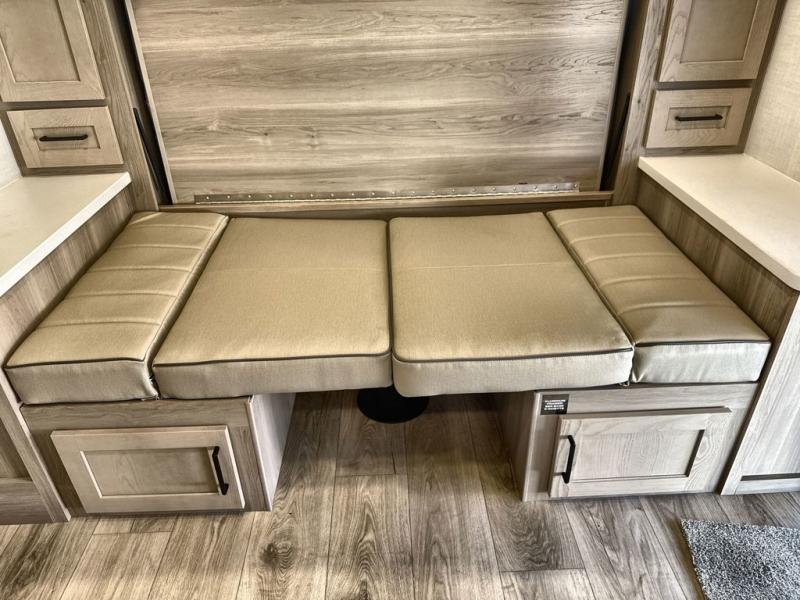 This versatile travel trailer is perfect for weekend camping trips to your favorite park! Once you arrive at your site, you can unload the pass-thru storage, then put out the 15' power awning and relax in your camp chairs. The cooktop and microwave inside will let you make lunch when you get hungry, and there is a theater seat slide out if you want a comfy place to relax. There is also a 30" x 80" booth dinette up front where you can dine together and play games in the evenings, and when you're ready for bed, the 60" x 74" Murphy bed can be folded down over the dinette. This unit includes plenty of storage spaces, including dual bedside wardrobes, a kitchen pantry, and a linen closet in the full rear bath!