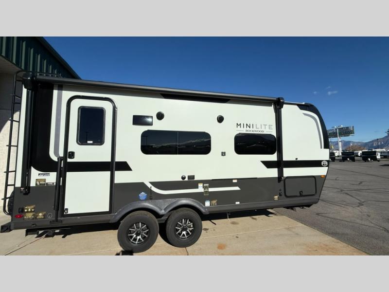 Each Rockwood Mini Lite travel trailer by Forest River is constructed with a fully laminated one-piece walkable roof, sleek frameless windows, and a six-sided full aluminum frame for strength and durability. The 12V thermostatically controlled heated tanks, plus radiant foil in the underbelly will allow you to camp well into the colder months, and the 200W roof solar panel will be perfect for a little off-gridding. Each model includes solid surface kitchen countertops, hidden hinge cabinet doors, roller shades, plus many more interior features. Having an AIR 360+ omnidirectional antenna with WiFi prep on board gives you the option to get some work done if it's needed, and the power tongue jack provides hassle-free set up, so you can enjoy more time relaxing!