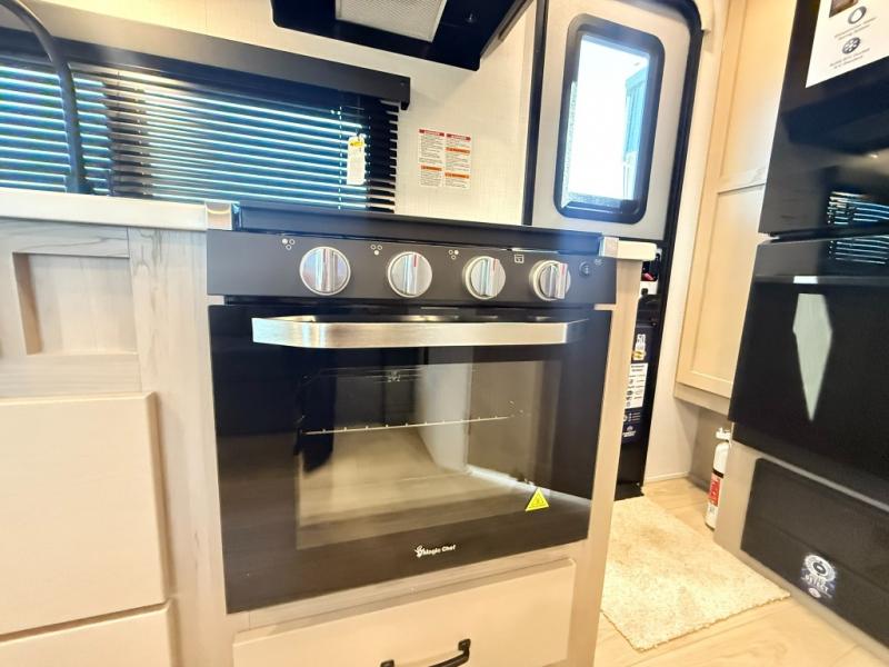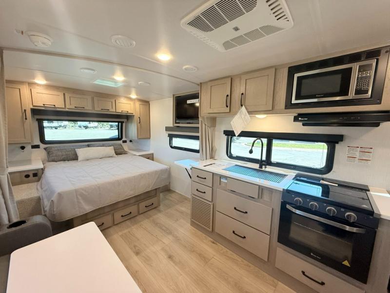 Wherever you decide to camp, you will love every minute in this cute couple's trailer. The sofa slide with a table will provide a place to relax, eat, and even sleep an extra guest if you have one, and the front RV queen bed includes a privacy curtain to enjoy your own space. There are dual bedroom wardrobes to keep your clothes tidy, and you'll find two pass-through storage compartments for your larger gear. An outside griddle with an LP hookup will allow you to make breakfast outdoors, and there is a three burner cooktop indoors if the weather isn't cooperating. Since there is a full bath on board you won't have to use the camp's facilities, and you can make it a movie night with the 32" TV in the main living area!