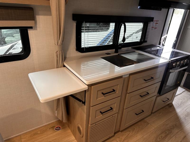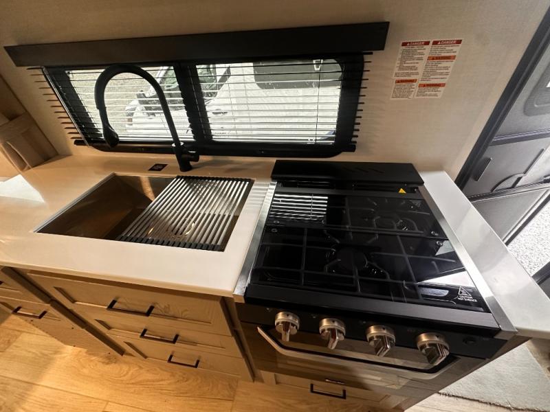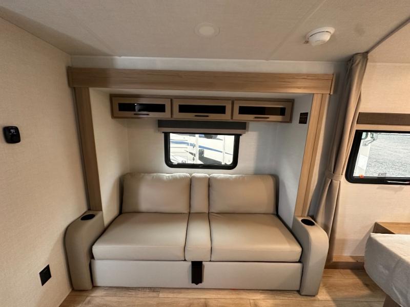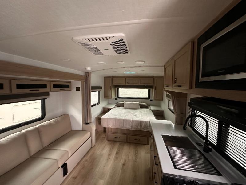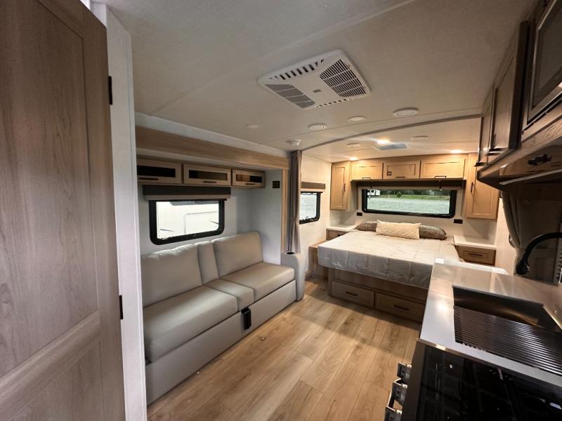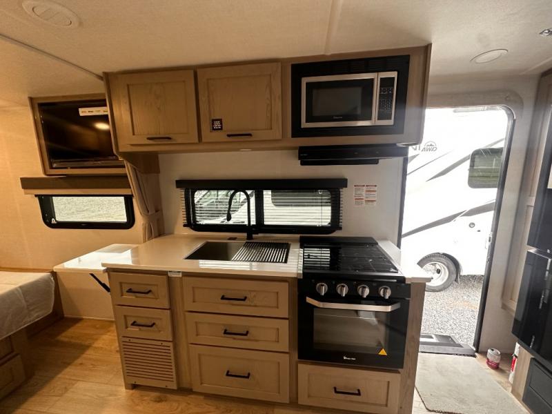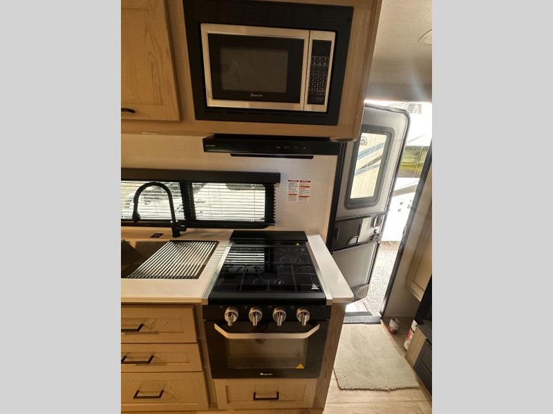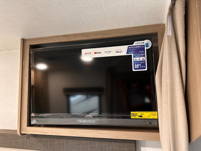 Wherever you decide to camp, you will love every minute in this cute couple's trailer. The sofa slide with a table will provide a place to relax, eat, and even sleep an extra guest if you have one, and the front RV queen bed includes a privacy curtain to enjoy your own space. There are dual bedroom wardrobes to keep your clothes tidy, and you'll find two pass-through storage compartments for your larger gear. An outside griddle with an LP hookup will allow you to make breakfast outdoors, and there is a three burner cooktop indoors if the weather isn't cooperating. Since there is a full bath on board you won't have to use the camp's facilities, and you can make it a movie night with the 32" TV in the main living area!