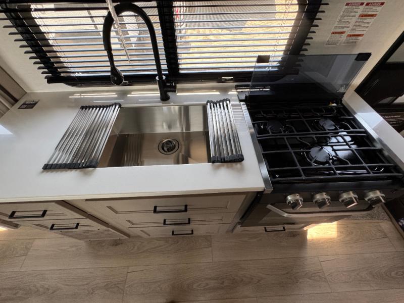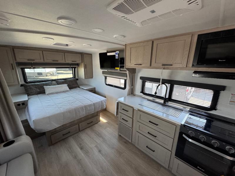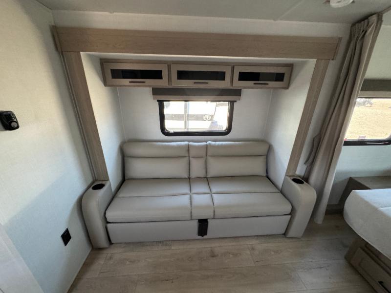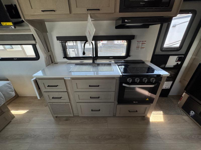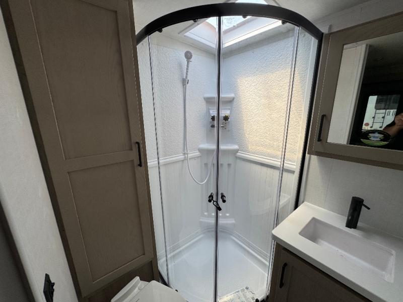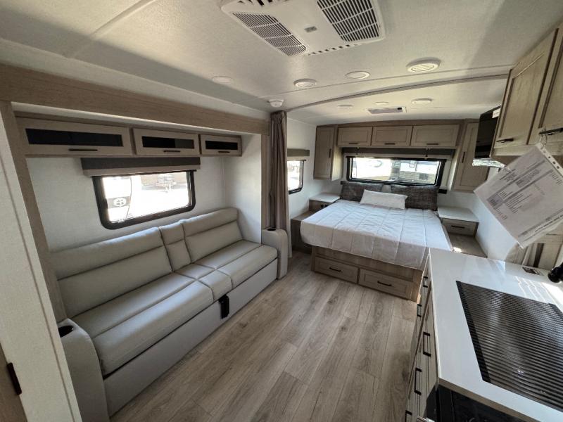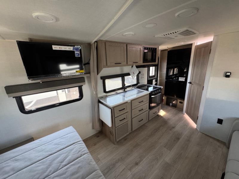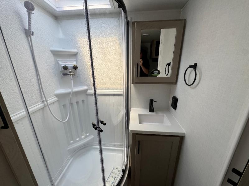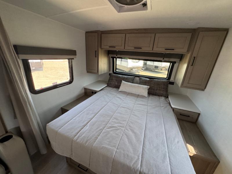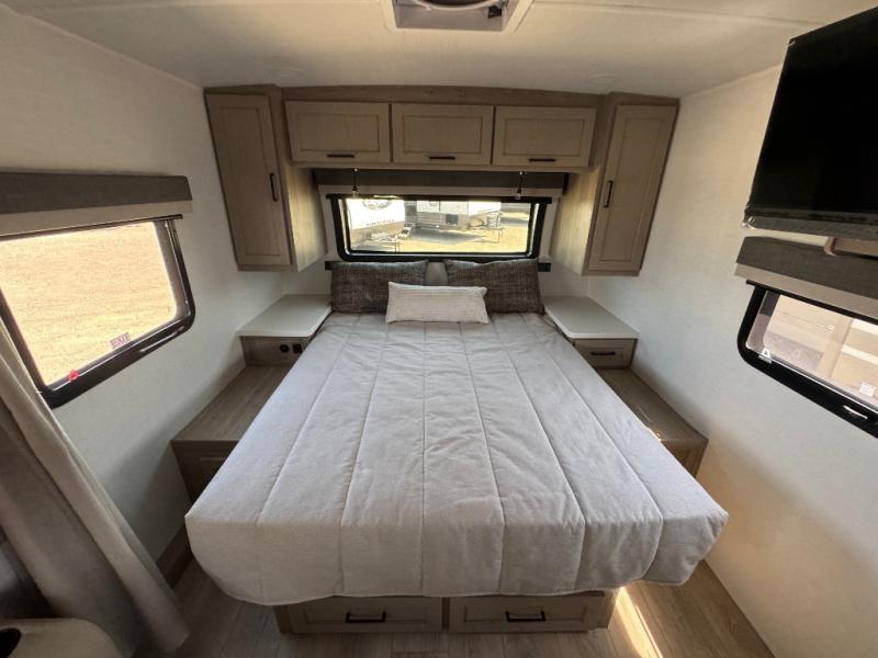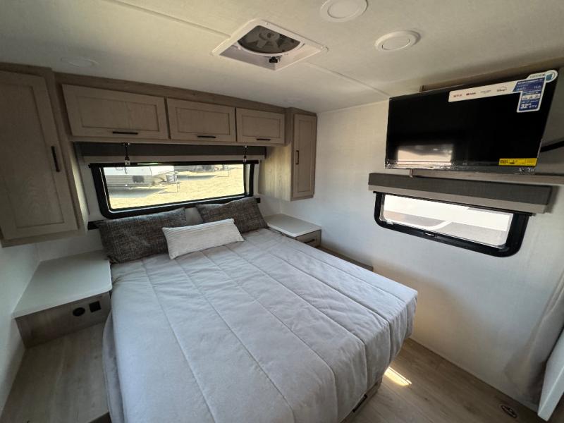 Wherever you decide to camp, you will love every minute in this cute couple's trailer. The sofa slide with a table will provide a place to relax, eat, and even sleep an extra guest if you have one, and the front RV queen bed includes a privacy curtain to enjoy your own space. There are dual bedroom wardrobes to keep your clothes tidy, and you'll find two pass-through storage compartments for your larger gear. An outside griddle with an LP hookup will allow you to make breakfast outdoors, and there is a three burner cooktop indoors if the weather isn't cooperating. Since there is a full bath on board you won't have to use the camp's facilities, and you can make it a movie night with the 32" TV in the main living area!