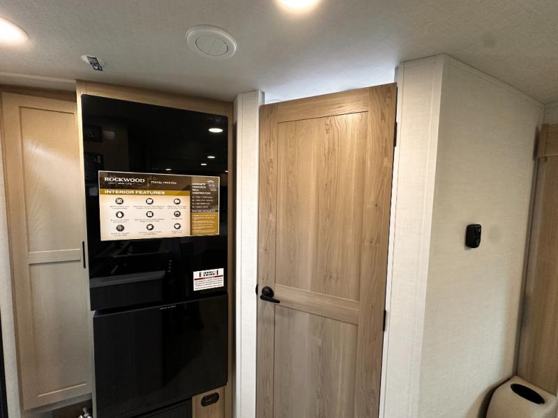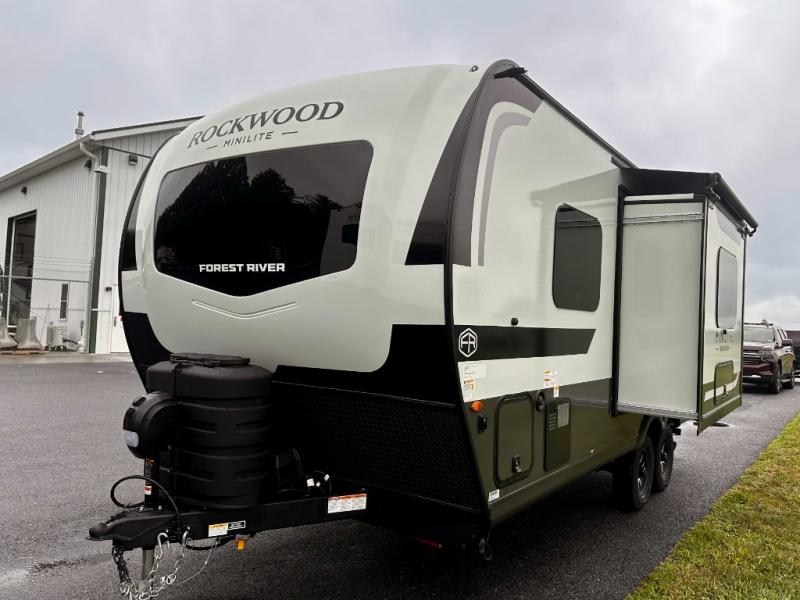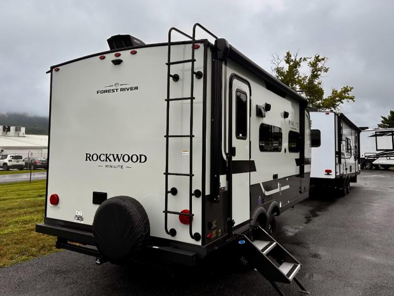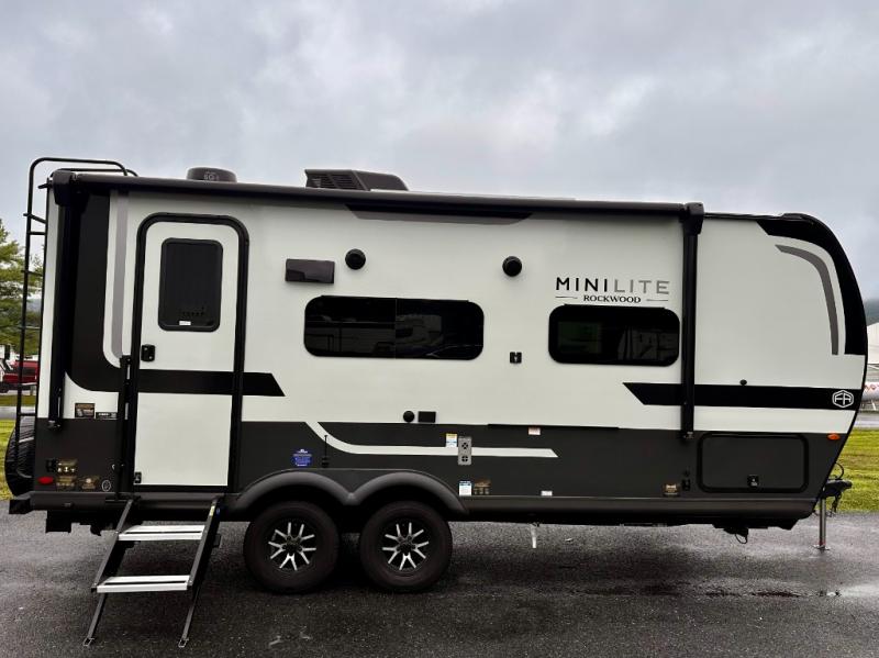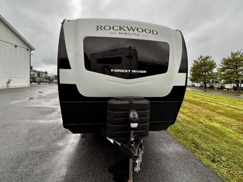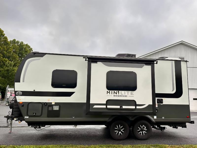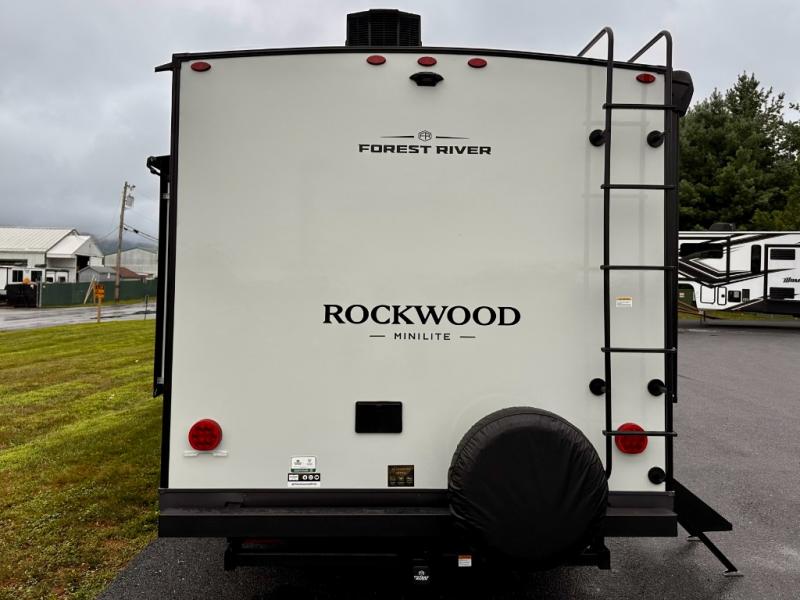 Each Rockwood Mini Lite travel trailer by Forest River is constructed with a fully laminated one-piece walkable roof, sleek frameless windows, and a six-sided full aluminum frame for strength and durability. The 12V thermostatically controlled heated tanks, plus radiant foil in the underbelly will allow you to camp well into the colder months, and the 200W roof solar panel will be perfect for a little off-gridding. Each model includes solid surface kitchen countertops, hidden hinge cabinet doors, roller shades, plus many more interior features. Having an AIR 360+ omnidirectional antenna with WiFi prep on board gives you the option to get some work done if it's needed, and the power tongue jack provides hassle-free set up, so you can enjoy more time relaxing!