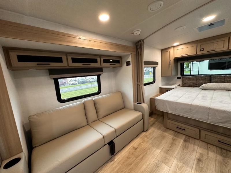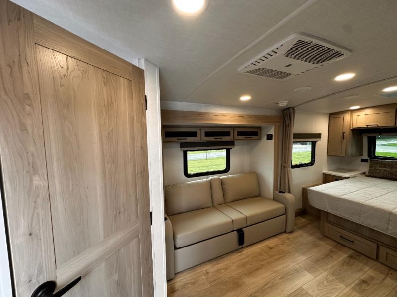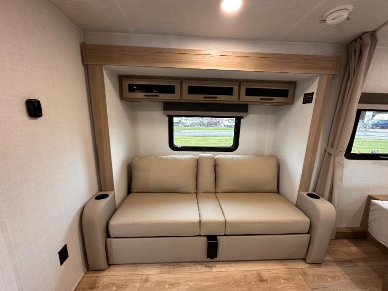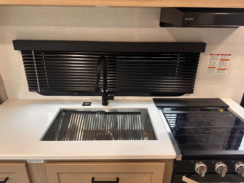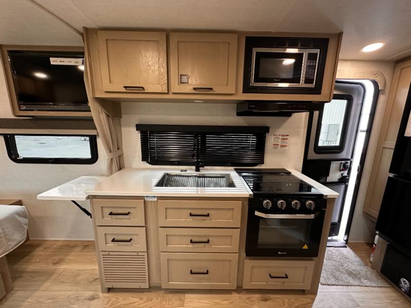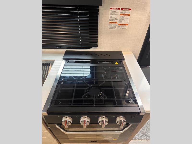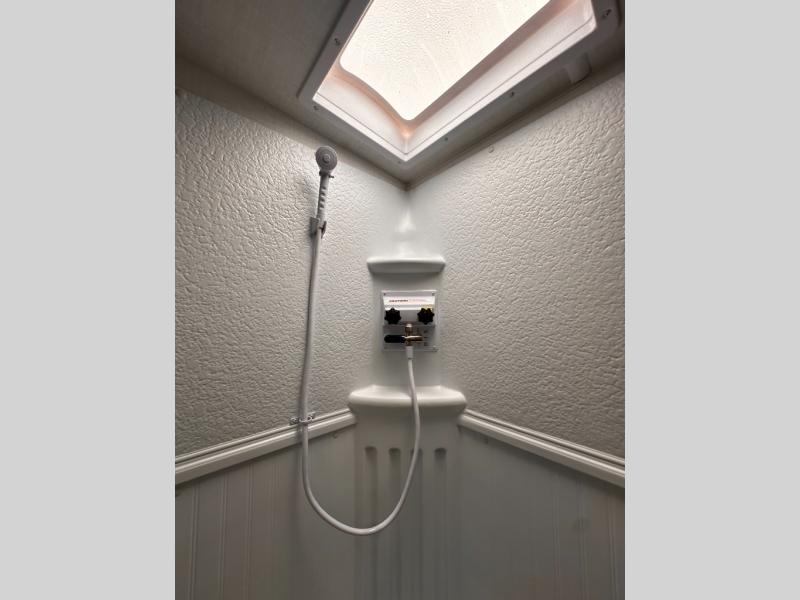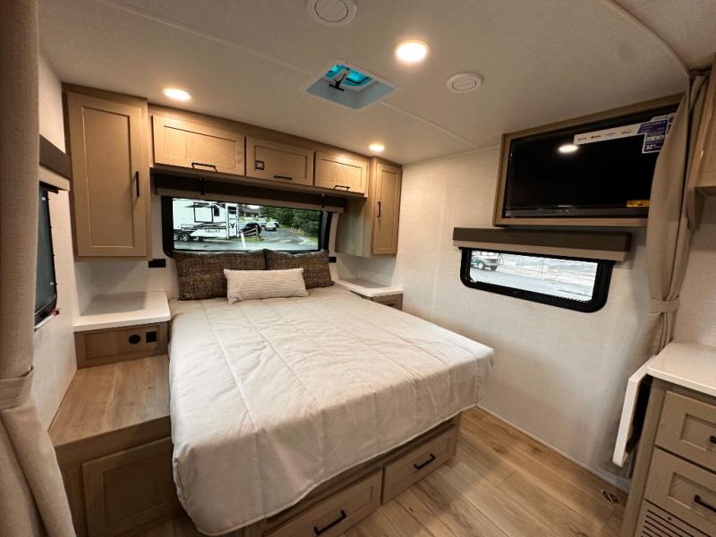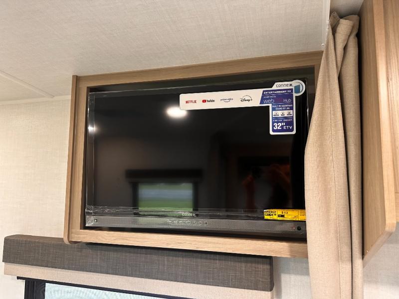 Wherever you decide to camp, you will love every minute in this cute couple's trailer. The sofa slide with a table will provide a place to relax, eat, and even sleep an extra guest if you have one, and the front RV queen bed includes a privacy curtain to enjoy your own space. There are dual bedroom wardrobes to keep your clothes tidy, and you'll find two pass-through storage compartments for your larger gear. An outside griddle with an LP hookup will allow you to make breakfast outdoors, and there is a three burner cooktop indoors if the weather isn't cooperating. Since there is a full bath on board you won't have to use the camp's facilities, and you can make it a movie night with the 32" TV in the main living area!