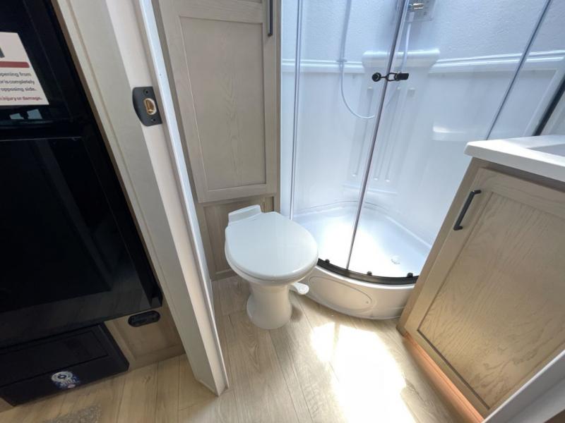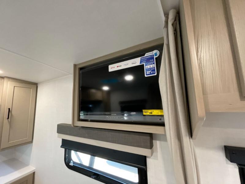Wherever you decide to camp, you will love every minute in this cute couple's trailer. The sofa slide with a table will provide a place to relax, eat, and even sleep an extra guest if you have one, and the front RV queen bed includes a privacy curtain to enjoy your own space. There are dual bedroom wardrobes to keep your clothes tidy, and you'll find two pass-through storage compartments for your larger gear. An outside griddle with an LP hookup will allow you to make breakfast outdoors, and there is a three burner cooktop indoors if the weather isn't cooperating. Since there is a full bath on board you won't have to use the camp's facilities, and you can make it a movie night with the 32" TV in the main living area!