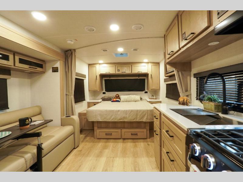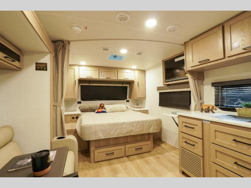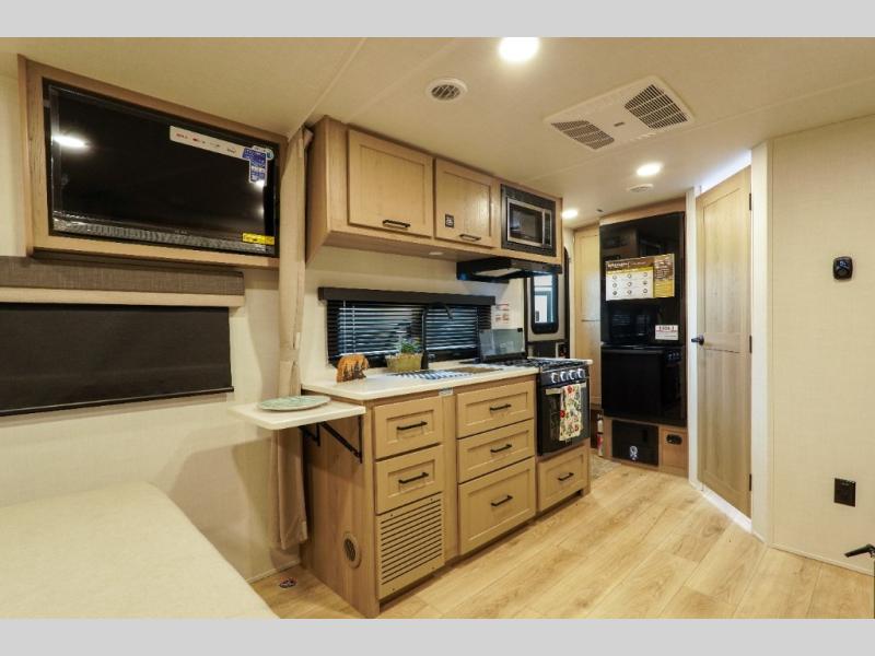 Wherever you decide to camp, you will love every minute in this cute couple's trailer. The sofa slide with a table will provide a place to relax, eat, and even sleep an extra guest if you have one, and the front RV queen bed includes a privacy curtain to enjoy your own space. There are dual bedroom wardrobes to keep your clothes tidy, and you'll find two pass-through storage compartments for your larger gear. An outside griddle with an LP hookup will allow you to make breakfast outdoors, and there is a three burner cooktop indoors if the weather isn't cooperating. Since there is a full bath on board you won't have to use the camp's facilities, and you can make it a movie night with the 32" TV in the main living area!