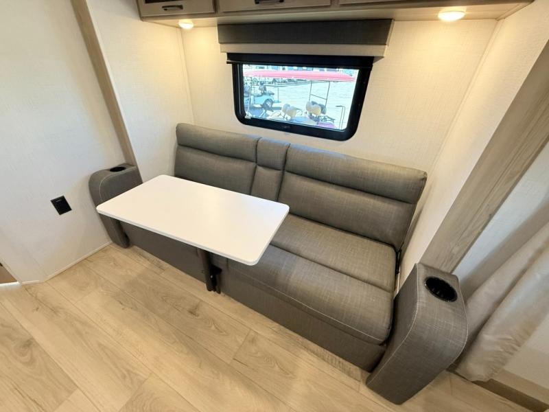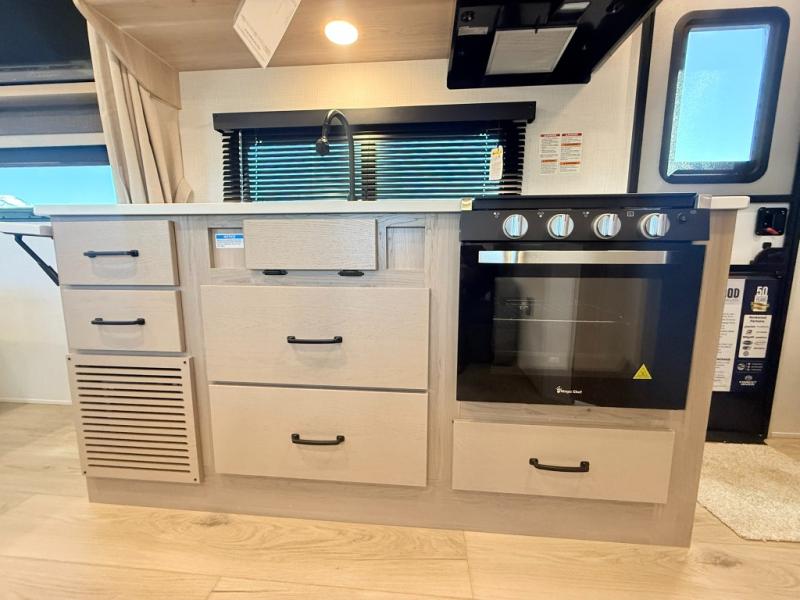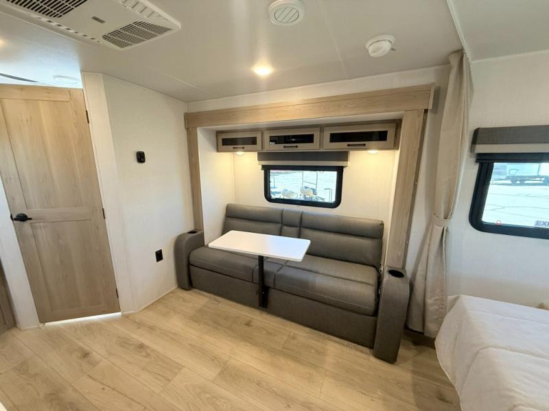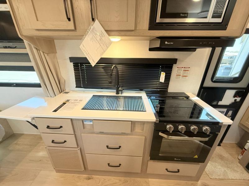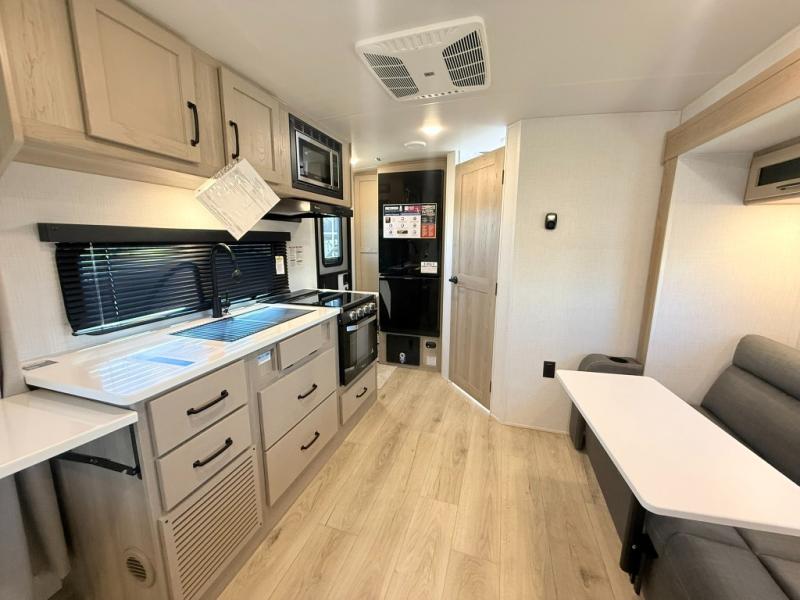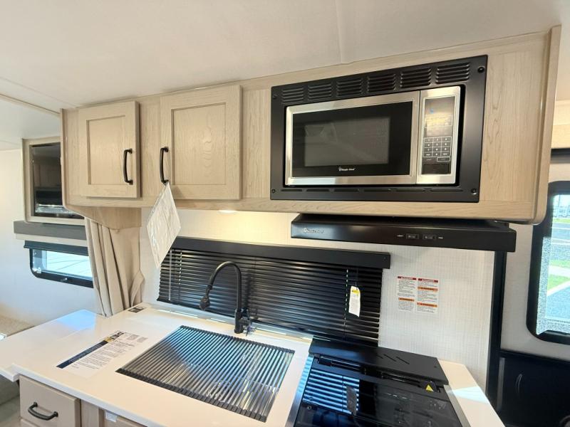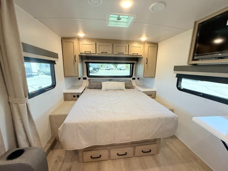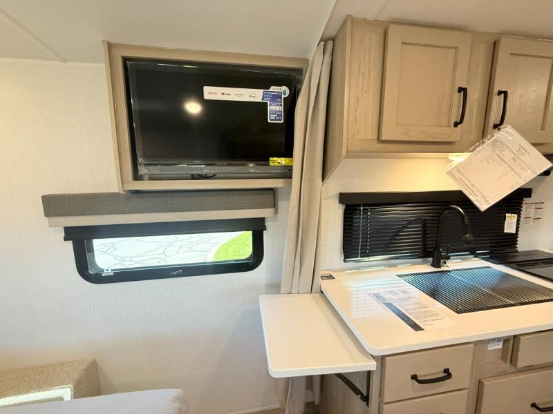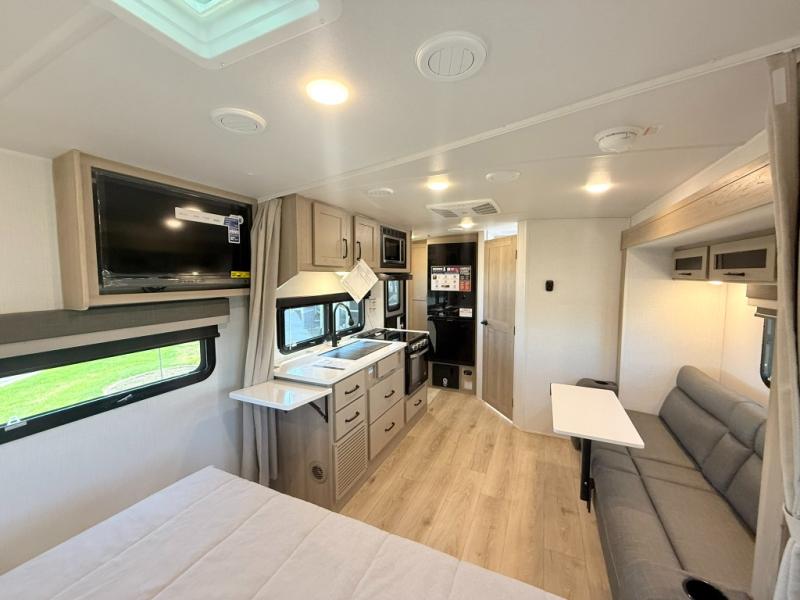 Wherever you decide to camp, you will love every minute in this cute couple's trailer. The sofa slide with a table will provide a place to relax, eat, and even sleep an extra guest if you have one, and the front RV queen bed includes a privacy curtain to enjoy your own space. There are dual bedroom wardrobes to keep your clothes tidy, and you'll find two pass-through storage compartments for your larger gear. An outside griddle with an LP hookup will allow you to make breakfast outdoors, and there is a three burner cooktop indoors if the weather isn't cooperating. Since there is a full bath on board you won't have to use the camp's facilities, and you can make it a movie night with the 32" TV in the main living area!