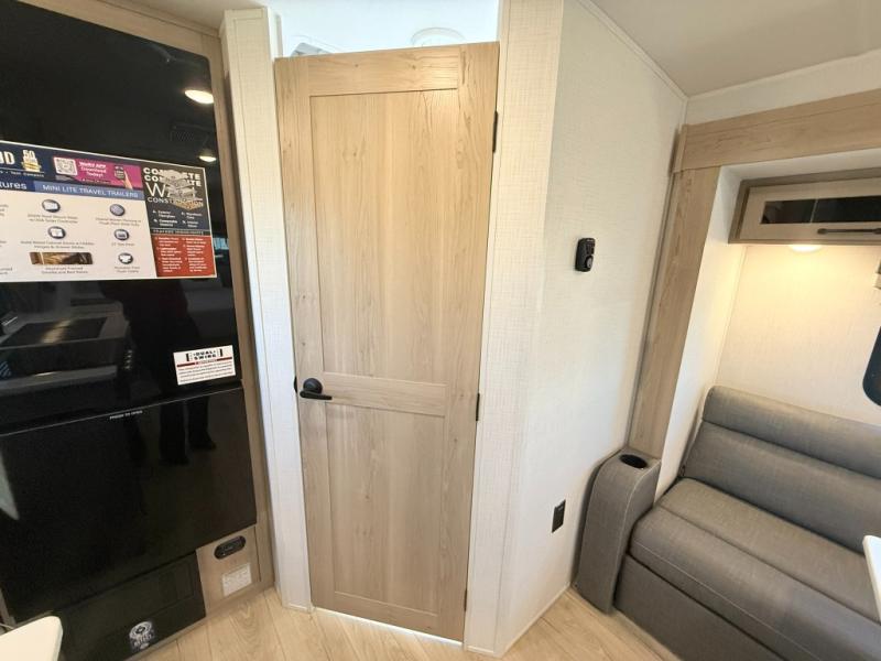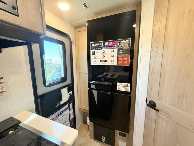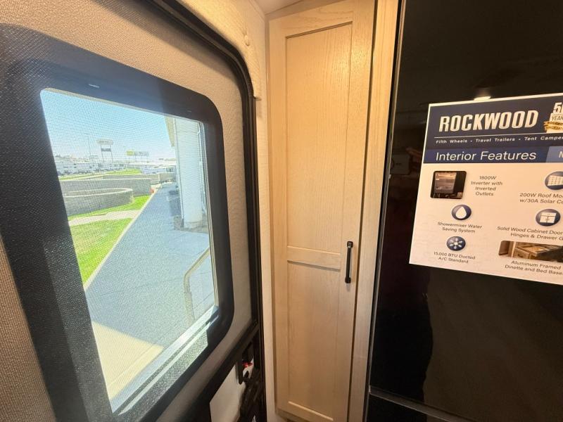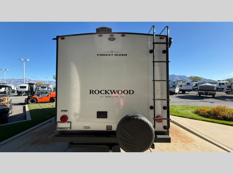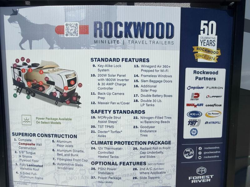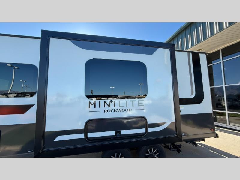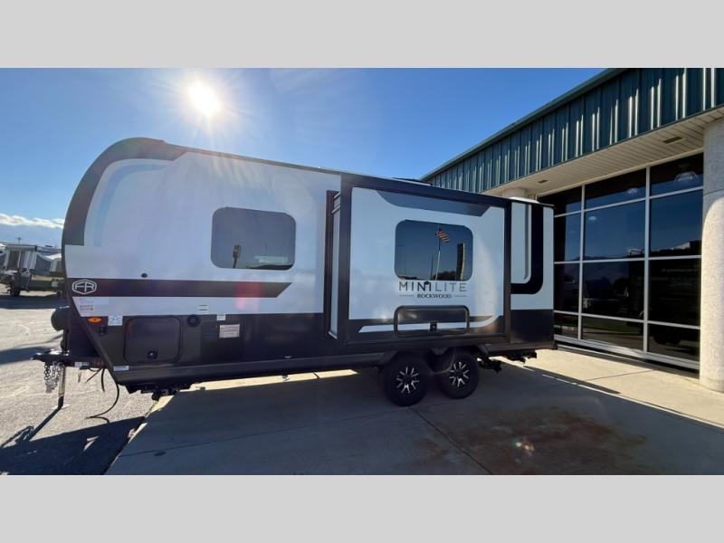 Each Rockwood Mini Lite travel trailer by Forest River is constructed with a fully laminated one-piece walkable roof, sleek frameless windows, and a six-sided full aluminum frame for strength and durability. The 12V thermostatically controlled heated tanks, plus radiant foil in the underbelly will allow you to camp well into the colder months, and the 200W roof solar panel will be perfect for a little off-gridding. Each model includes solid surface kitchen countertops, hidden hinge cabinet doors, roller shades, plus many more interior features. Having an AIR 360+ omnidirectional antenna with WiFi prep on board gives you the option to get some work done if it's needed, and the power tongue jack provides hassle-free set up, so you can enjoy more time relaxing!