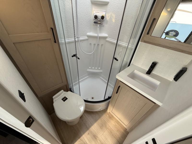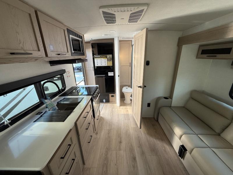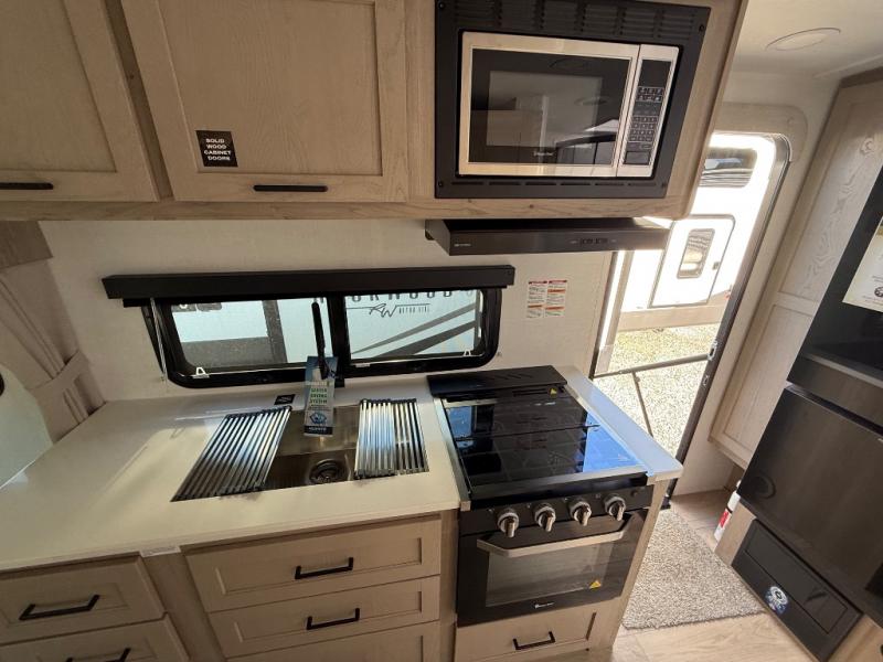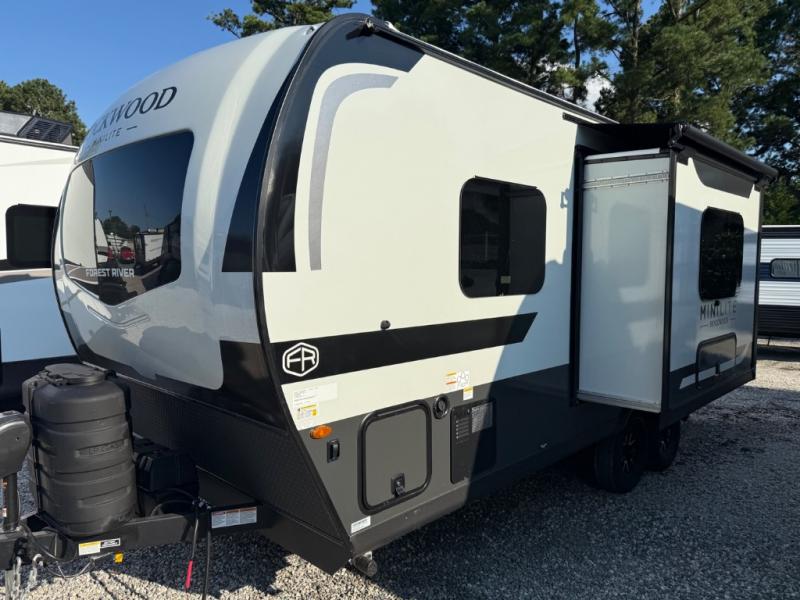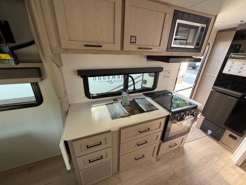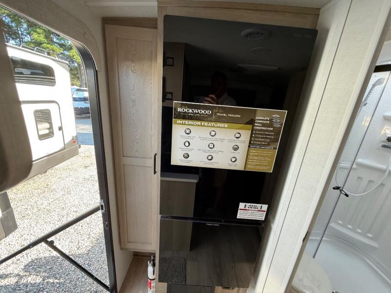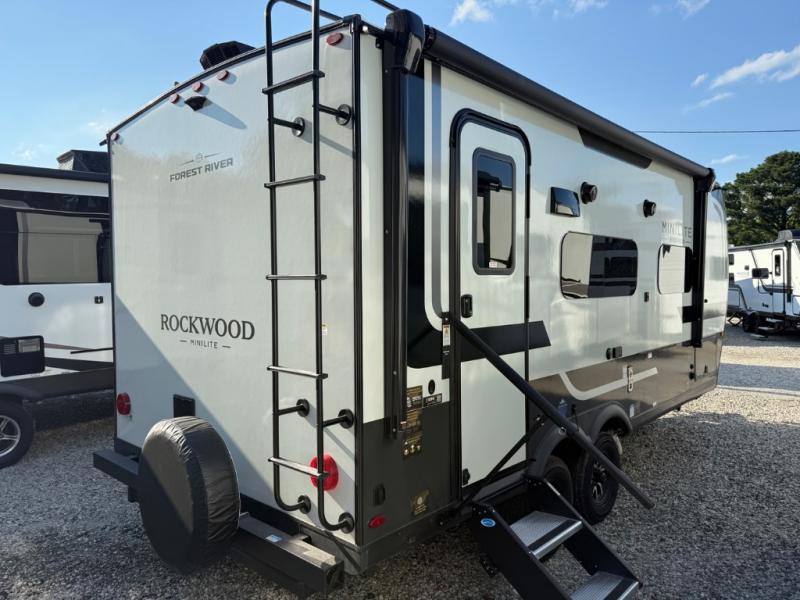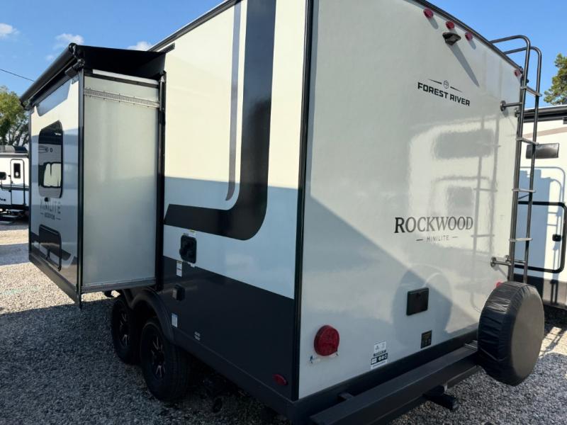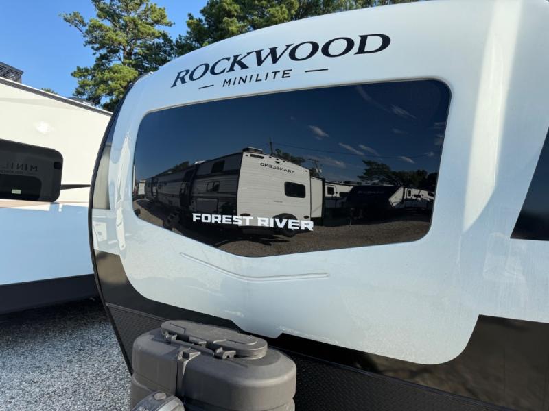 Each Rockwood Mini Lite travel trailer by Forest River is constructed with a fully laminated one-piece walkable roof, sleek frameless windows, and a six-sided full aluminum frame for strength and durability. The 12V thermostatically controlled heated tanks, plus radiant foil in the underbelly will allow you to camp well into the colder months, and the 200W roof solar panel will be perfect for a little off-gridding. Each model includes solid surface kitchen countertops, hidden hinge cabinet doors, roller shades, plus many more interior features. Having an AIR 360+ omnidirectional antenna with WiFi prep on board gives you the option to get some work done if it's needed, and the power tongue jack provides hassle-free set up, so you can enjoy more time relaxing!