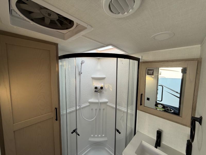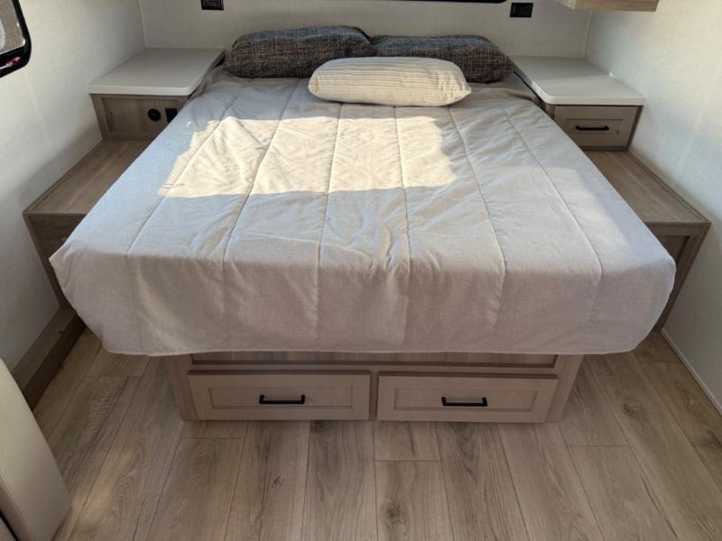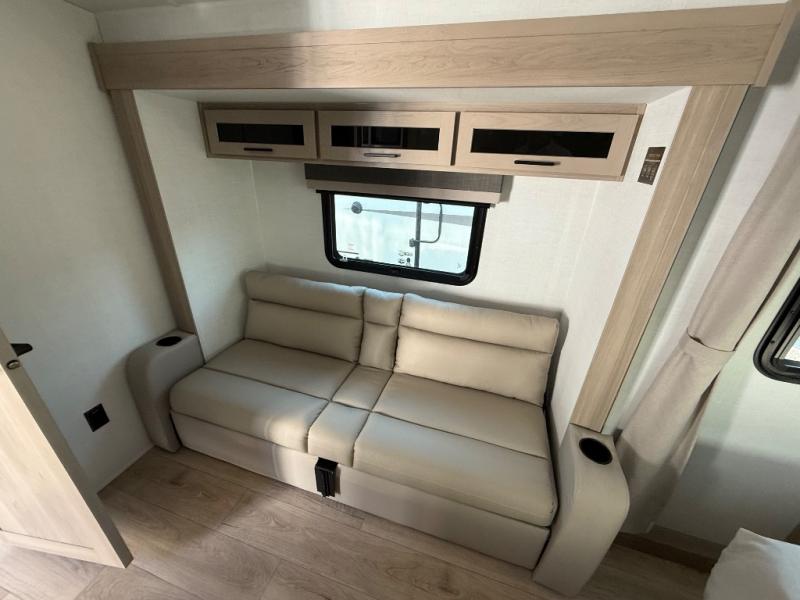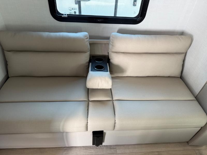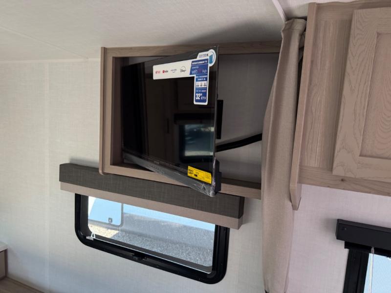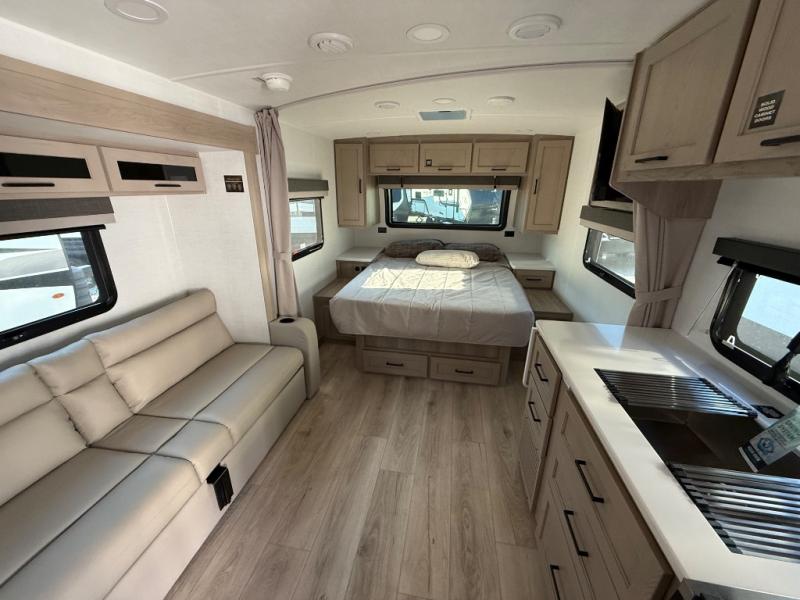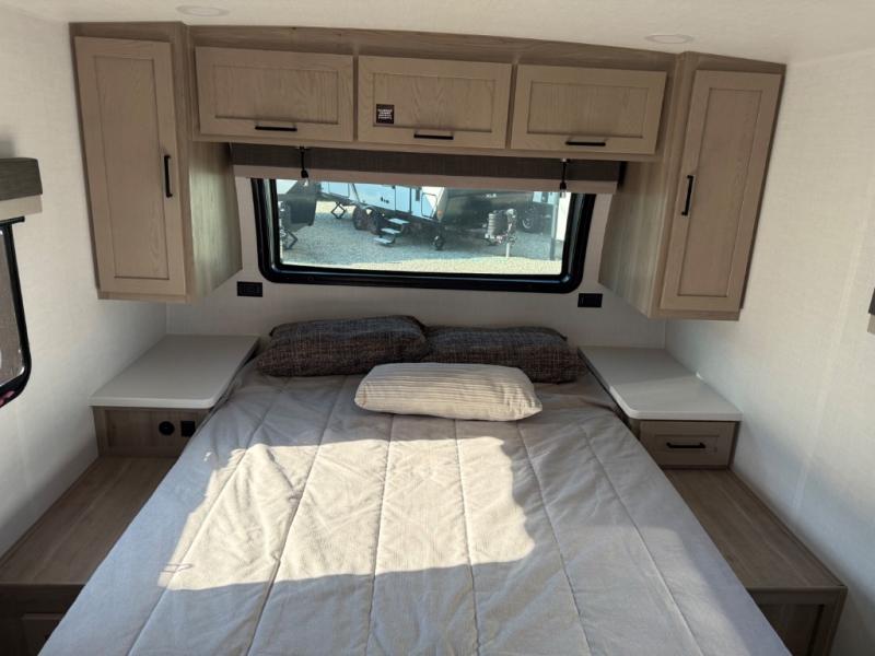 Wherever you decide to camp, you will love every minute in this cute couple's trailer. The sofa slide with a table will provide a place to relax, eat, and even sleep an extra guest if you have one, and the front RV queen bed includes a privacy curtain to enjoy your own space. There are dual bedroom wardrobes to keep your clothes tidy, and you'll find two pass-through storage compartments for your larger gear. An outside griddle with an LP hookup will allow you to make breakfast outdoors, and there is a three burner cooktop indoors if the weather isn't cooperating. Since there is a full bath on board you won't have to use the camp's facilities, and you can make it a movie night with the 32" TV in the main living area!