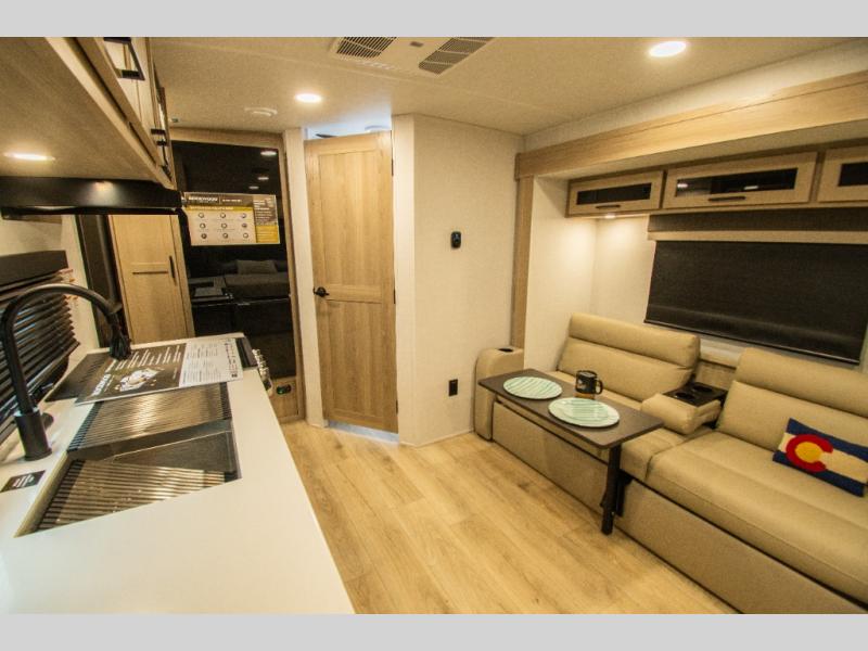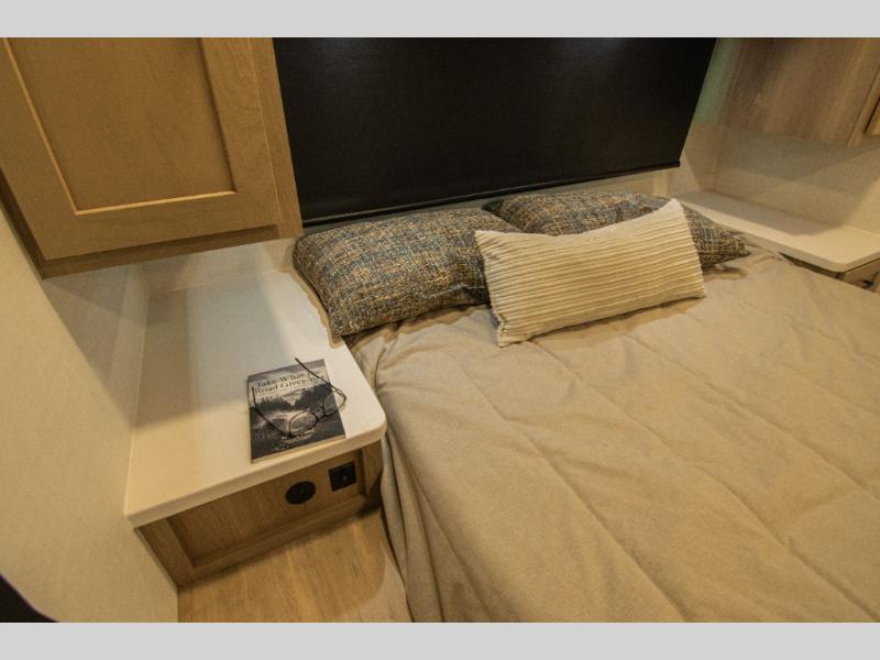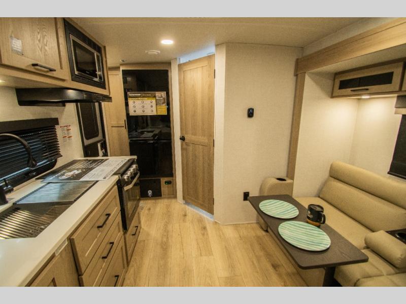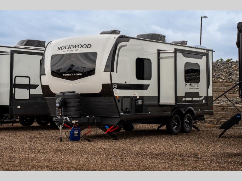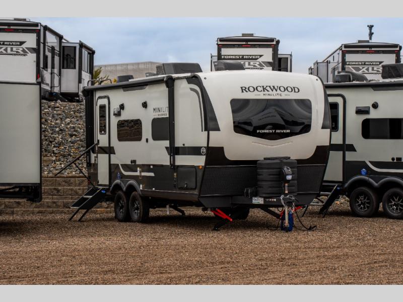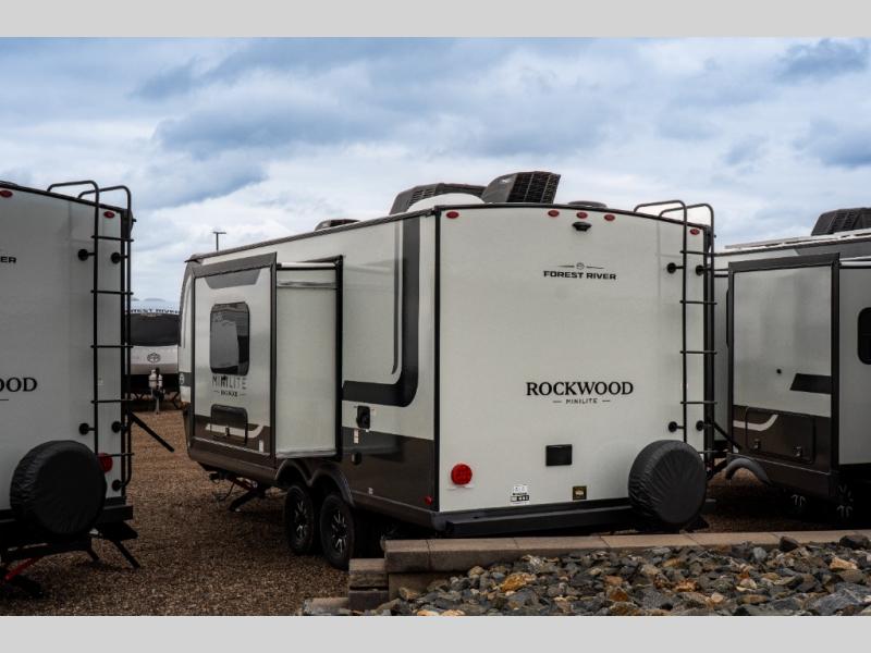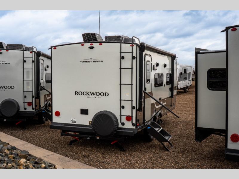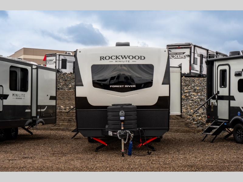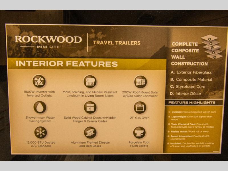 Each Rockwood Mini Lite travel trailer by Forest River is constructed with a fully laminated one-piece walkable roof, sleek frameless windows, and a six-sided full aluminum frame for strength and durability. The 12V thermostatically controlled heated tanks, plus radiant foil in the underbelly will allow you to camp well into the colder months, and the 200W roof solar panel will be perfect for a little off-gridding. Each model includes solid surface kitchen countertops, hidden hinge cabinet doors, roller shades, plus many more interior features. Having an AIR 360+ omnidirectional antenna with WiFi prep on board gives you the option to get some work done if it's needed, and the power tongue jack provides hassle-free set up, so you can enjoy more time relaxing!