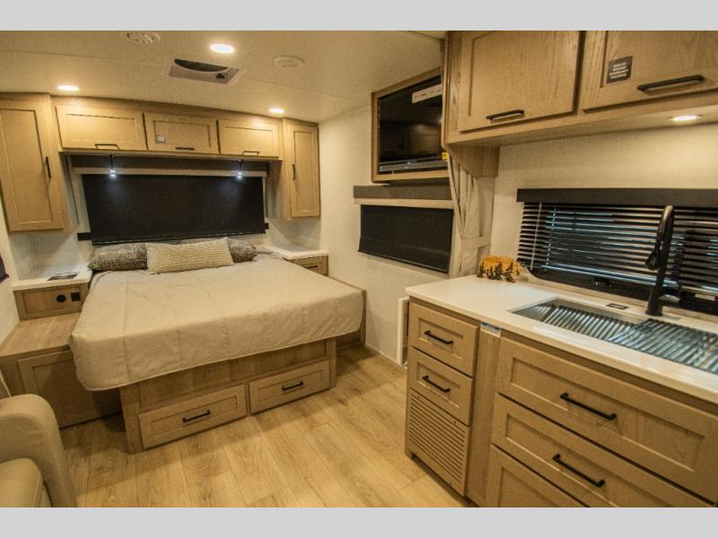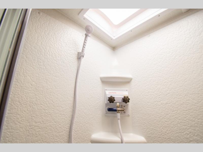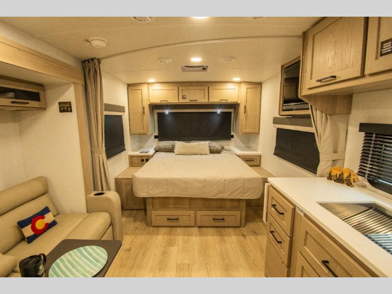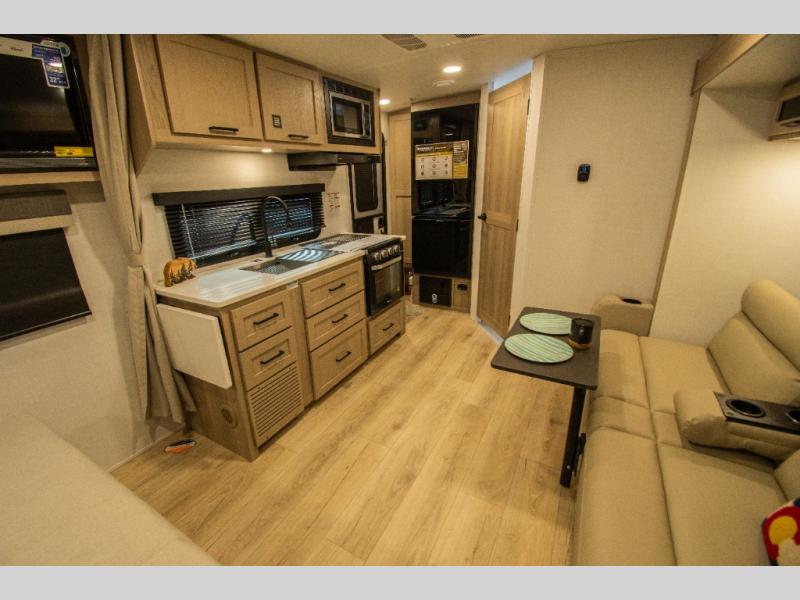 Wherever you decide to camp, you will love every minute in this cute couple's trailer. The sofa slide with a table will provide a place to relax, eat, and even sleep an extra guest if you have one, and the front RV queen bed includes a privacy curtain to enjoy your own space. There are dual bedroom wardrobes to keep your clothes tidy, and you'll find two pass-through storage compartments for your larger gear. An outside griddle with an LP hookup will allow you to make breakfast outdoors, and there is a three burner cooktop indoors if the weather isn't cooperating. Since there is a full bath on board you won't have to use the camp's facilities, and you can make it a movie night with the 32" TV in the main living area!