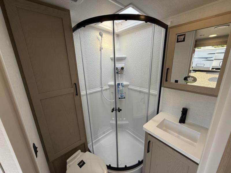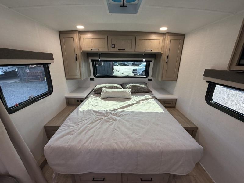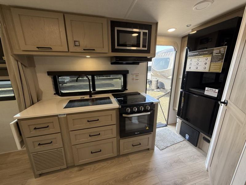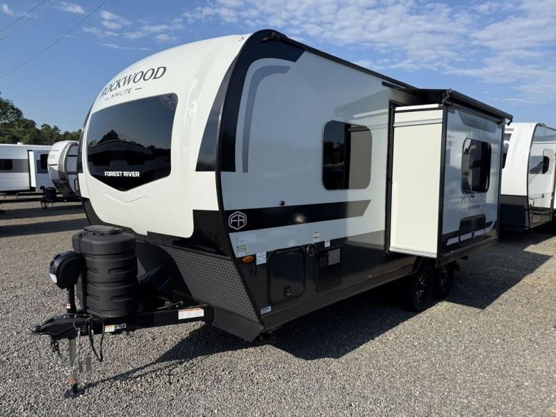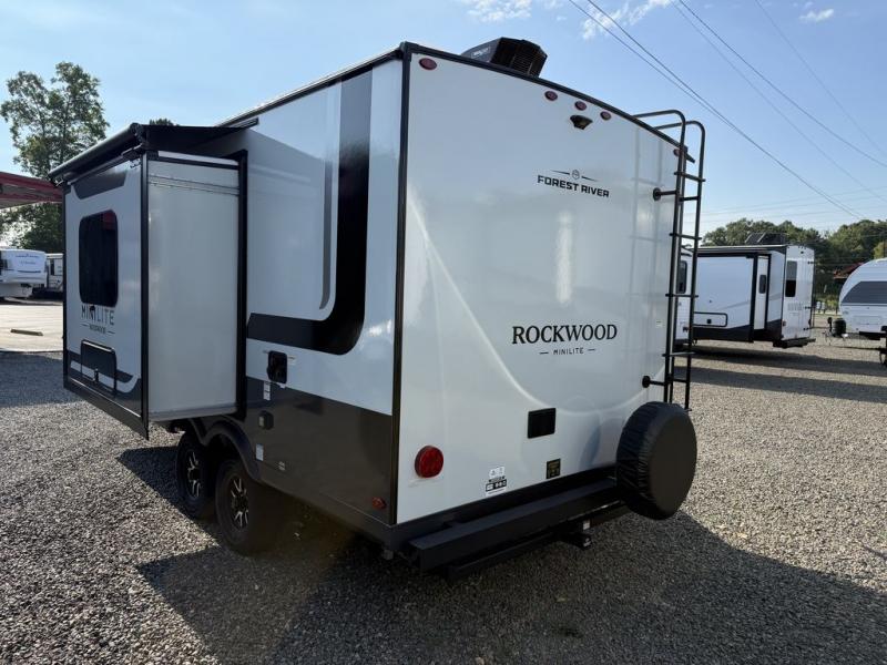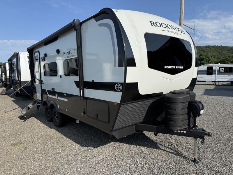 Each Rockwood Mini Lite travel trailer by Forest River is constructed with a fully laminated one-piece walkable roof, sleek frameless windows, and a six-sided full aluminum frame for strength and durability. The 12V thermostatically controlled heated tanks, plus radiant foil in the underbelly will allow you to camp well into the colder months, and the 200W roof solar panel will be perfect for a little off-gridding. Each model includes solid surface kitchen countertops, hidden hinge cabinet doors, roller shades, plus many more interior features. Having an AIR 360+ omnidirectional antenna with WiFi prep on board gives you the option to get some work done if it's needed, and the power tongue jack provides hassle-free set up, so you can enjoy more time relaxing!