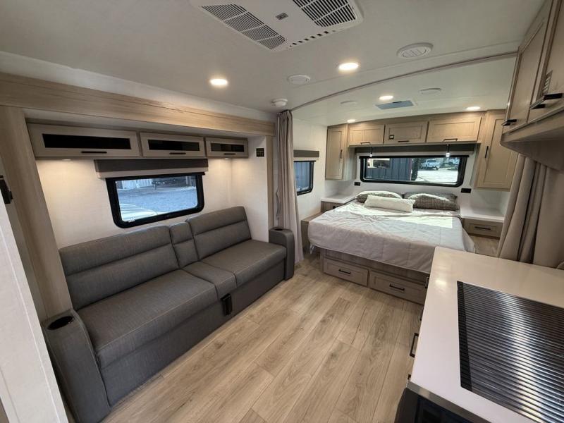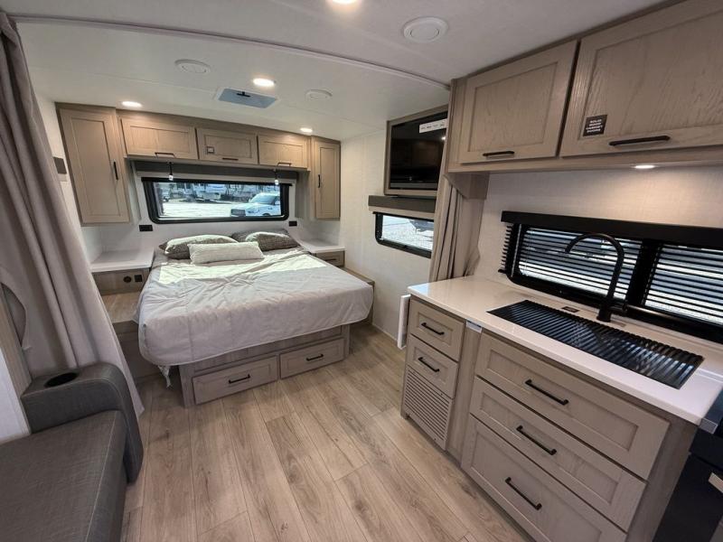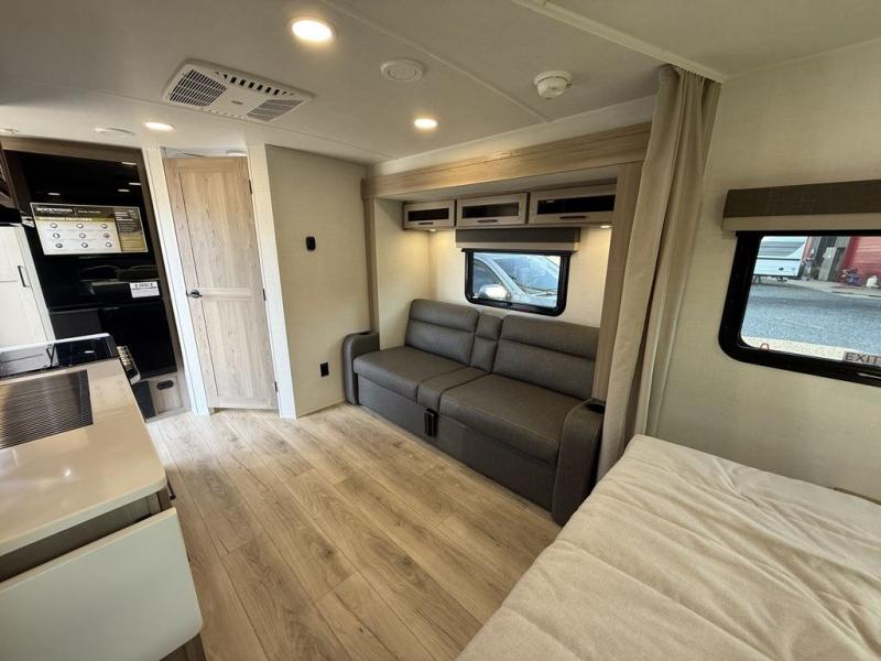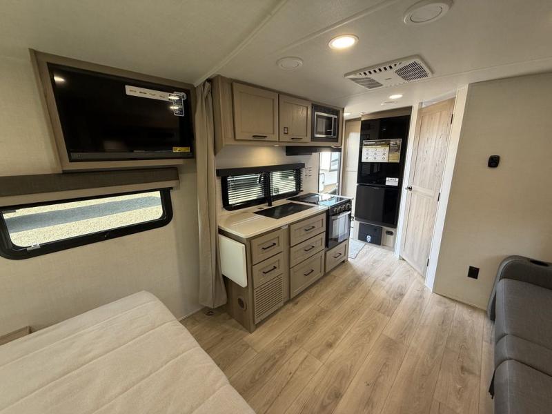 Wherever you decide to camp, you will love every minute in this cute couple's trailer. The sofa slide with a table will provide a place to relax, eat, and even sleep an extra guest if you have one, and the front RV queen bed includes a privacy curtain to enjoy your own space. There are dual bedroom wardrobes to keep your clothes tidy, and you'll find two pass-through storage compartments for your larger gear. An outside griddle with an LP hookup will allow you to make breakfast outdoors, and there is a three burner cooktop indoors if the weather isn't cooperating. Since there is a full bath on board you won't have to use the camp's facilities, and you can make it a movie night with the 32" TV in the main living area!