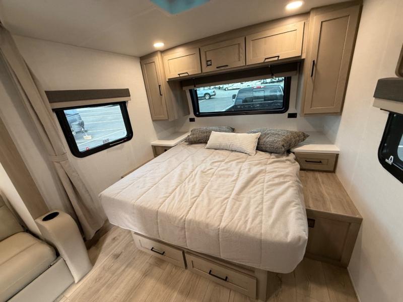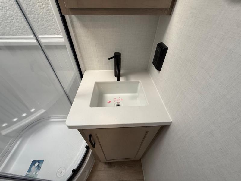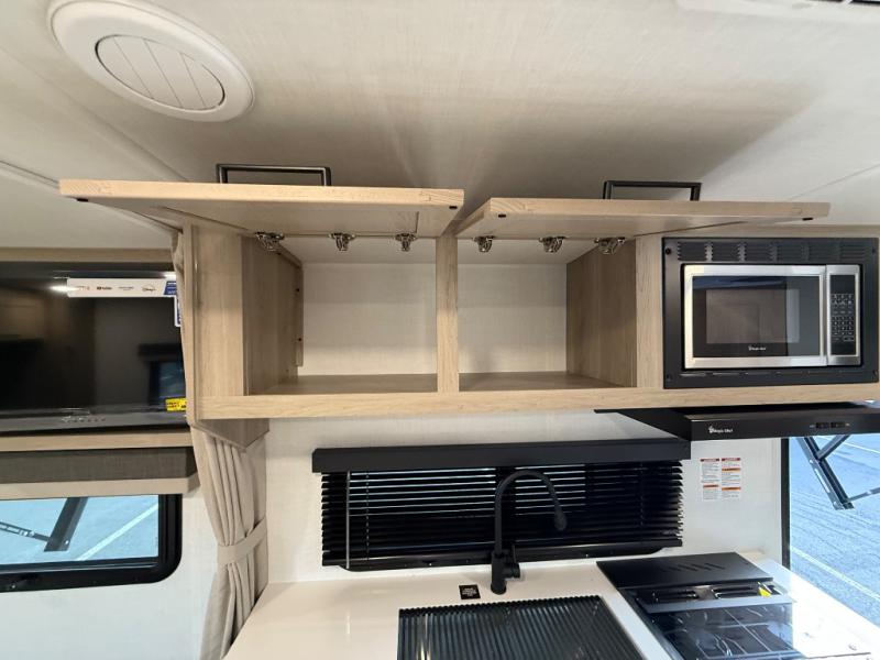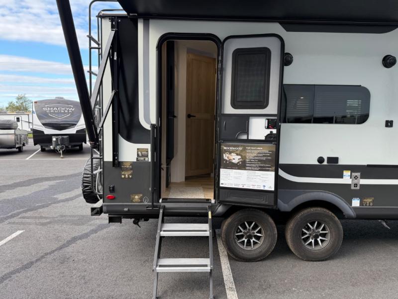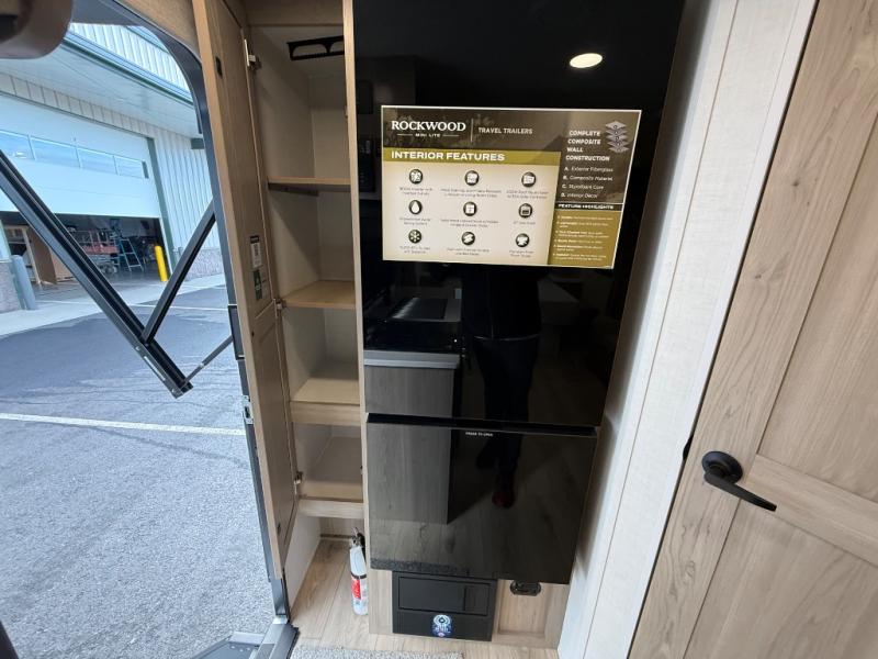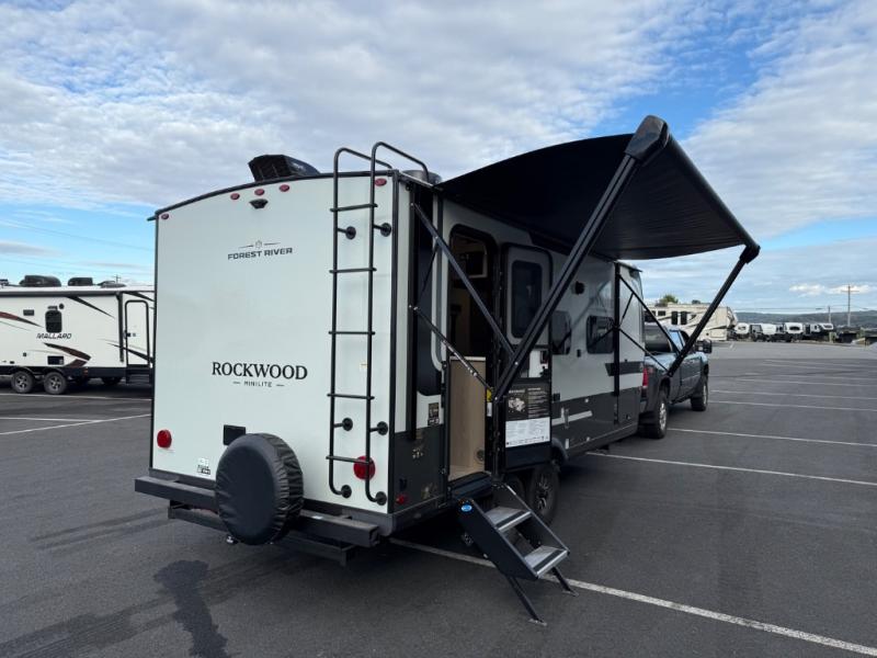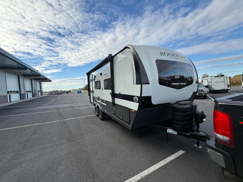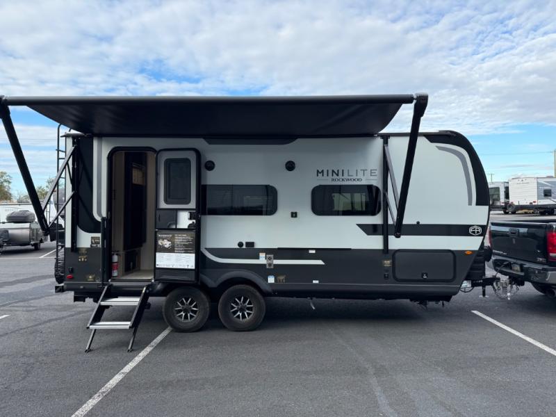 Each Rockwood Mini Lite travel trailer by Forest River is constructed with a fully laminated one-piece walkable roof, sleek frameless windows, and a six-sided full aluminum frame for strength and durability. The 12V thermostatically controlled heated tanks, plus radiant foil in the underbelly will allow you to camp well into the colder months, and the 200W roof solar panel will be perfect for a little off-gridding. Each model includes solid surface kitchen countertops, hidden hinge cabinet doors, roller shades, plus many more interior features. Having an AIR 360+ omnidirectional antenna with WiFi prep on board gives you the option to get some work done if it's needed, and the power tongue jack provides hassle-free set up, so you can enjoy more time relaxing!