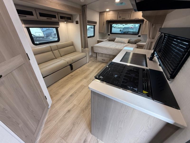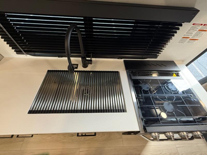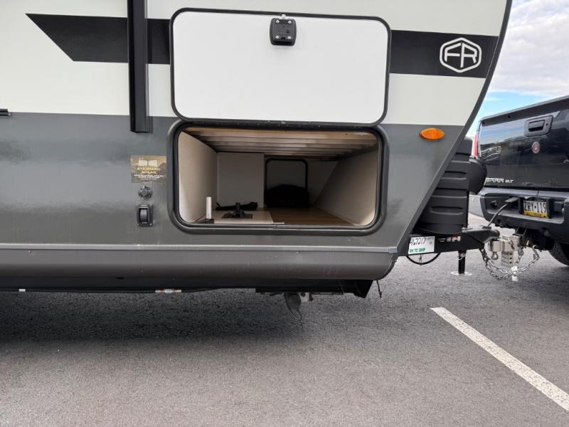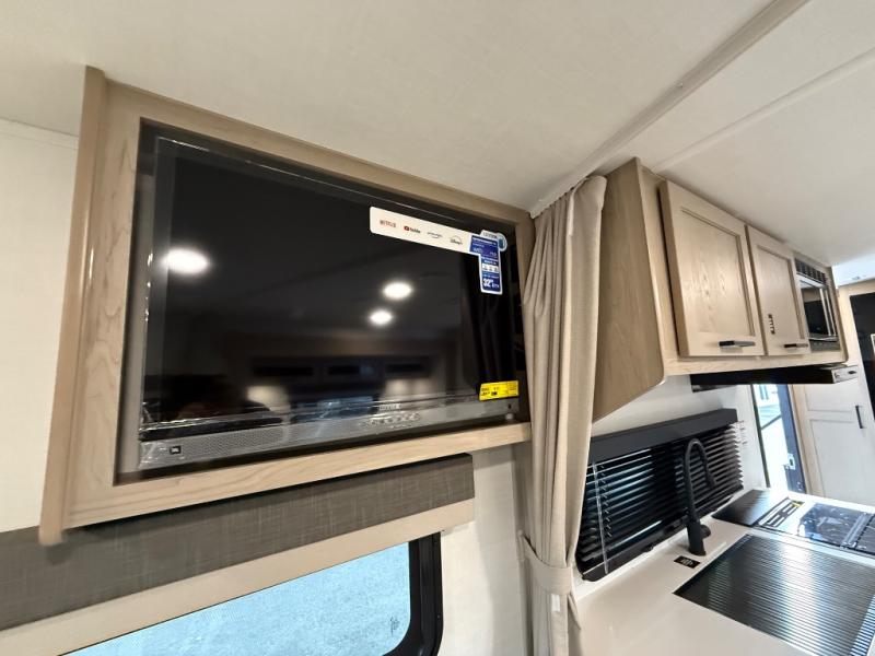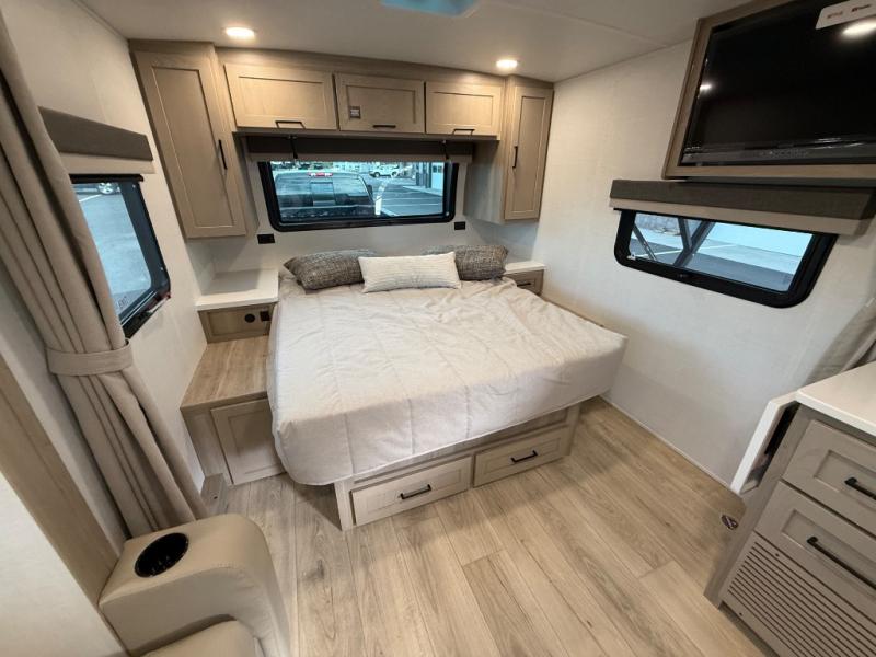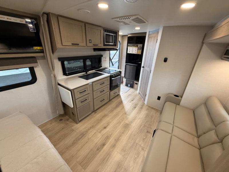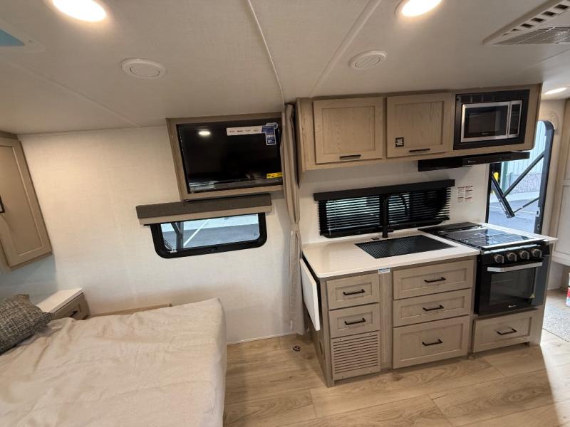 Wherever you decide to camp, you will love every minute in this cute couple's trailer. The sofa slide with a table will provide a place to relax, eat, and even sleep an extra guest if you have one, and the front RV queen bed includes a privacy curtain to enjoy your own space. There are dual bedroom wardrobes to keep your clothes tidy, and you'll find two pass-through storage compartments for your larger gear. An outside griddle with an LP hookup will allow you to make breakfast outdoors, and there is a three burner cooktop indoors if the weather isn't cooperating. Since there is a full bath on board you won't have to use the camp's facilities, and you can make it a movie night with the 32" TV in the main living area!