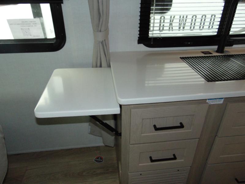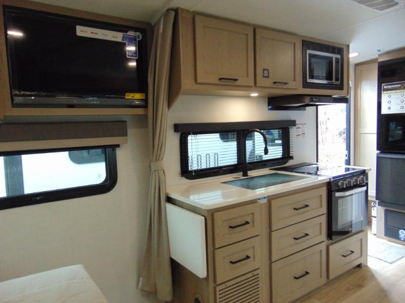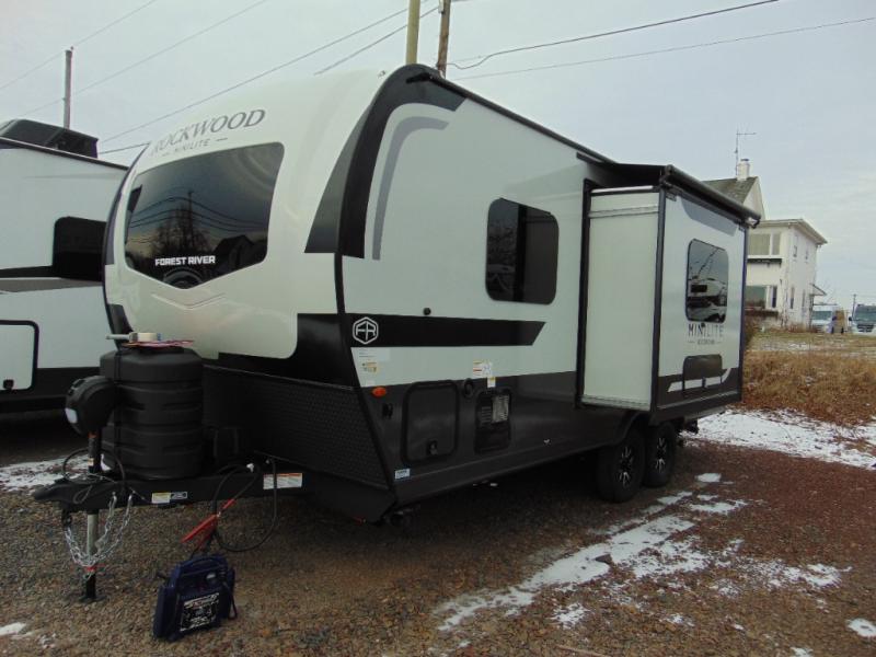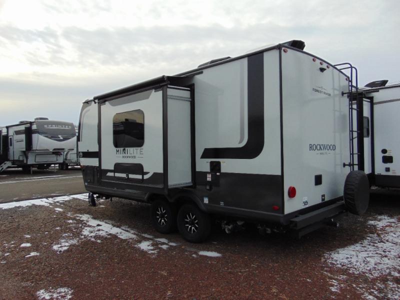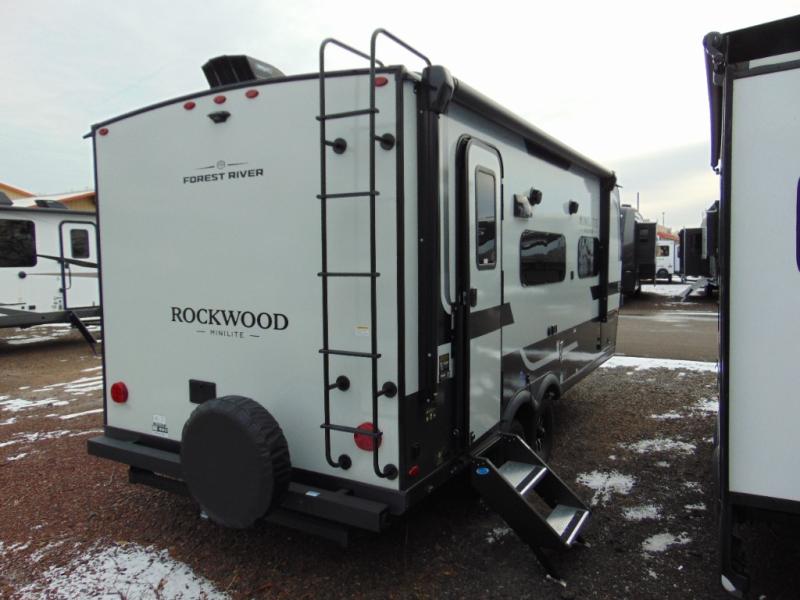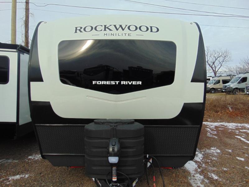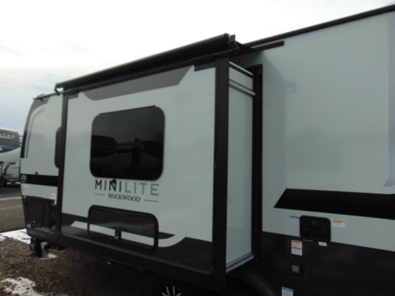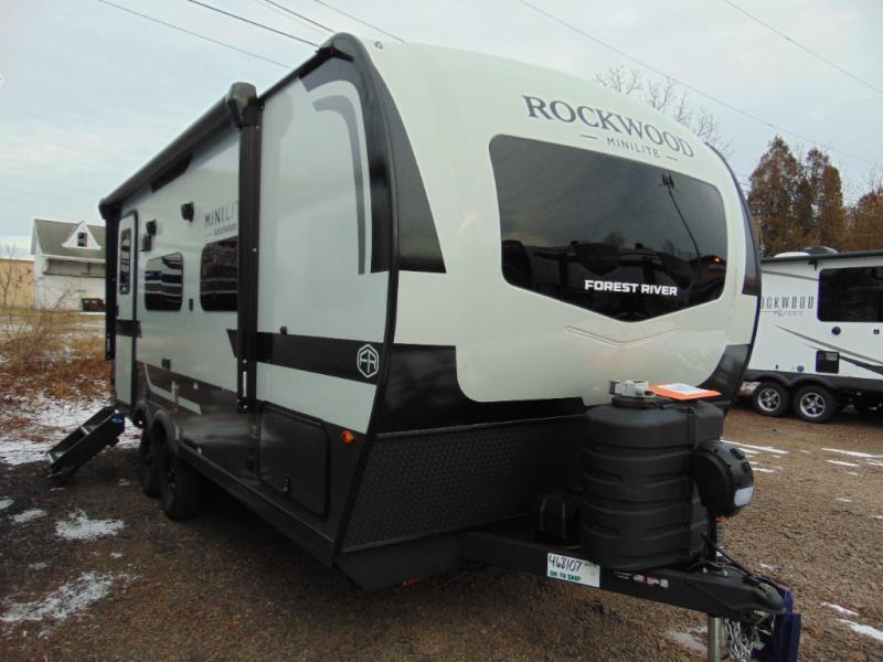 Each Rockwood Mini Lite travel trailer by Forest River is constructed with a fully laminated one-piece walkable roof, sleek frameless windows, and a six-sided full aluminum frame for strength and durability. The 12V thermostatically controlled heated tanks, plus radiant foil in the underbelly will allow you to camp well into the colder months, and the 200W roof solar panel will be perfect for a little off-gridding. Each model includes solid surface kitchen countertops, hidden hinge cabinet doors, roller shades, plus many more interior features. Having an AIR 360+ omnidirectional antenna with WiFi prep on board gives you the option to get some work done if it's needed, and the power tongue jack provides hassle-free set up, so you can enjoy more time relaxing!