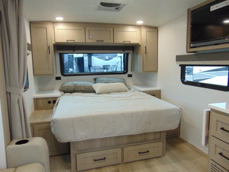 Wherever you decide to camp, you will love every minute in this cute couple's trailer. The sofa slide with a table will provide a place to relax, eat, and even sleep an extra guest if you have one, and the front RV queen bed includes a privacy curtain to enjoy your own space. There are dual bedroom wardrobes to keep your clothes tidy, and you'll find two pass-through storage compartments for your larger gear. An outside griddle with an LP hookup will allow you to make breakfast outdoors, and there is a three burner cooktop indoors if the weather isn't cooperating. Since there is a full bath on board you won't have to use the camp's facilities, and you can make it a movie night with the 32" TV in the main living area!