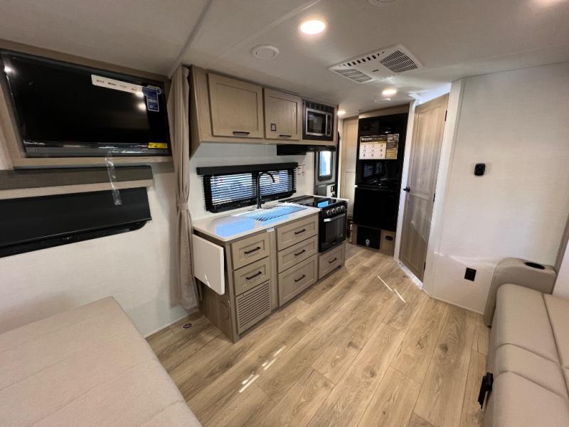 Wherever you decide to camp, you will love every minute in this cute couple's trailer. The sofa slide with a table will provide a place to relax, eat, and even sleep an extra guest if you have one, and the front RV queen bed includes a privacy curtain to enjoy your own space. There are dual bedroom wardrobes to keep your clothes tidy, and you'll find two pass-through storage compartments for your larger gear. An outside griddle with an LP hookup will allow you to make breakfast outdoors, and there is a three burner cooktop indoors if the weather isn't cooperating. Since there is a full bath on board you won't have to use the camp's facilities, and you can make it a movie night with the 32" TV in the main living area!
