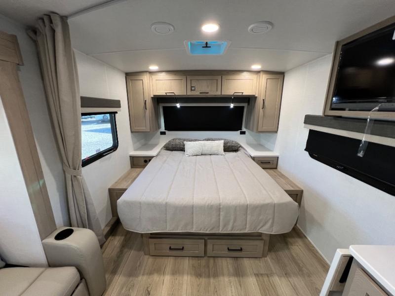 Wherever you decide to camp, you will love every minute in this cute couple's trailer. The sofa slide with a table will provide a place to relax, eat, and even sleep an extra guest if you have one, and the front RV queen bed includes a privacy curtain to enjoy your own space. There are dual bedroom wardrobes to keep your clothes tidy, and you'll find two pass-through storage compartments for your larger gear. An outside griddle with an LP hookup will allow you to make breakfast outdoors, and there is a three burner cooktop indoors if the weather isn't cooperating. Since there is a full bath on board you won't have to use the camp's facilities, and you can make it a movie night with the 32" TV in the main living area!