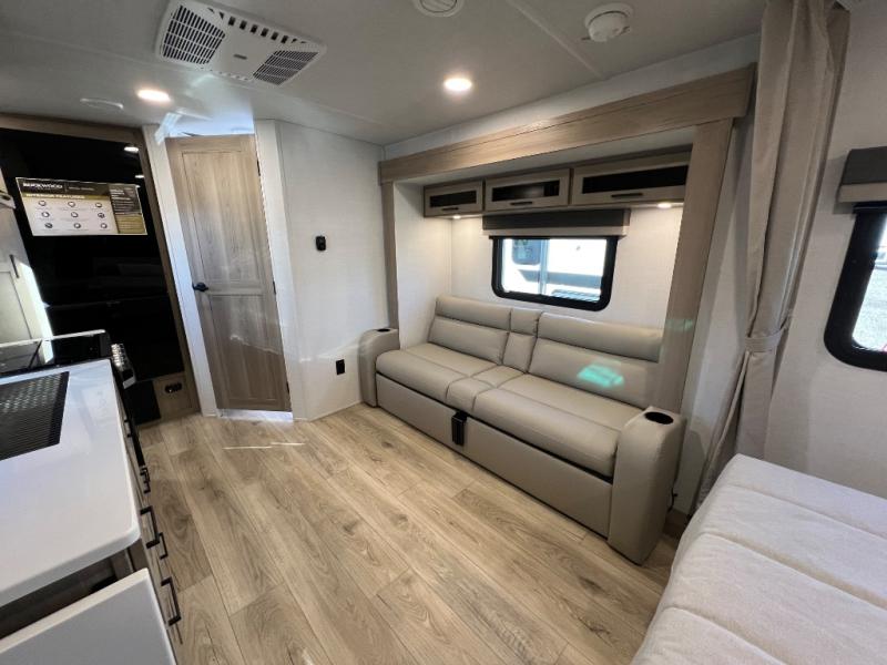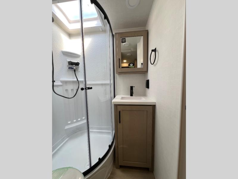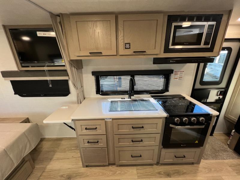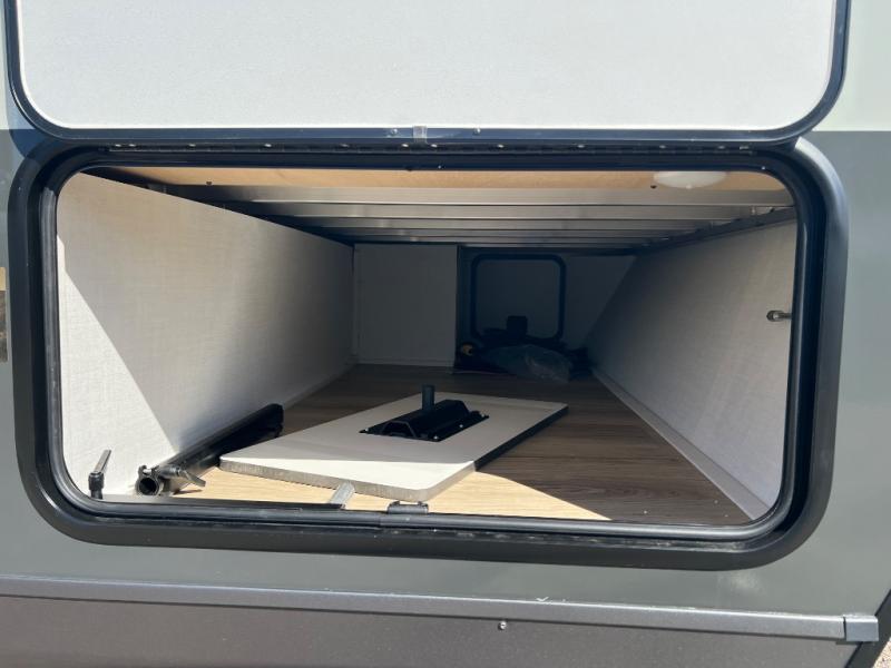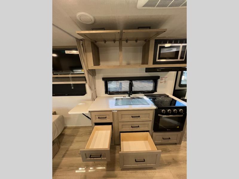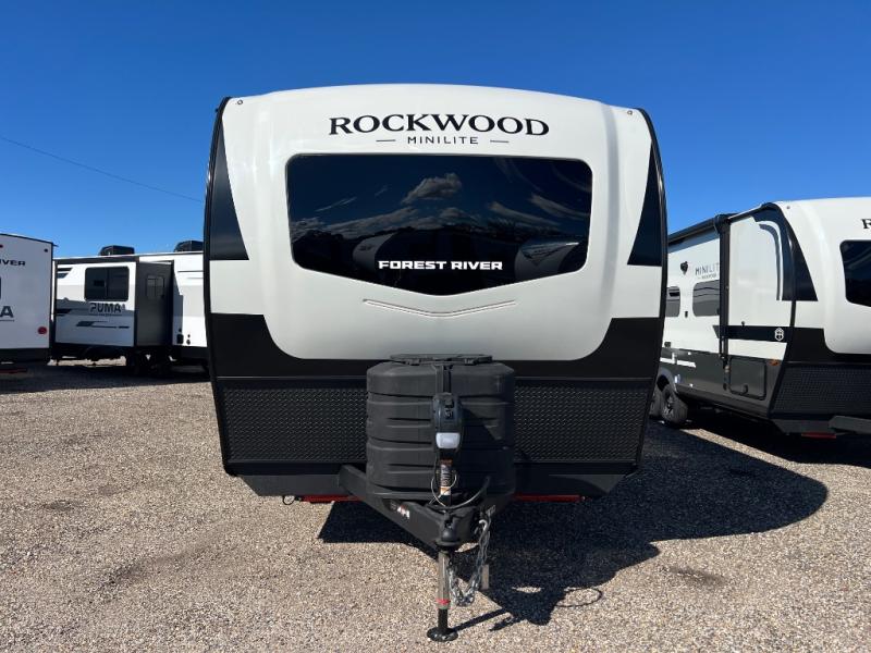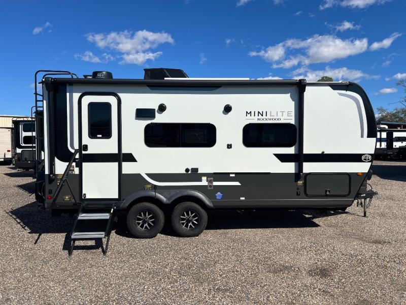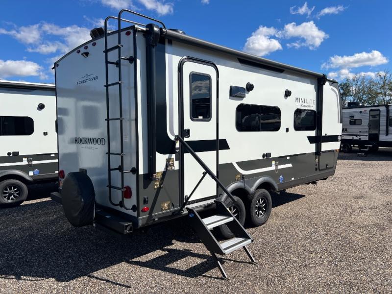 Each Rockwood Mini Lite travel trailer by Forest River is constructed with a fully laminated one-piece walkable roof, sleek frameless windows, and a six-sided full aluminum frame for strength and durability. The 12V thermostatically controlled heated tanks, plus radiant foil in the underbelly will allow you to camp well into the colder months, and the 200W roof solar panel will be perfect for a little off-gridding. Each model includes solid surface kitchen countertops, hidden hinge cabinet doors, roller shades, plus many more interior features. Having an AIR 360+ omnidirectional antenna with WiFi prep on board gives you the option to get some work done if it's needed, and the power tongue jack provides hassle-free set up, so you can enjoy more time relaxing!