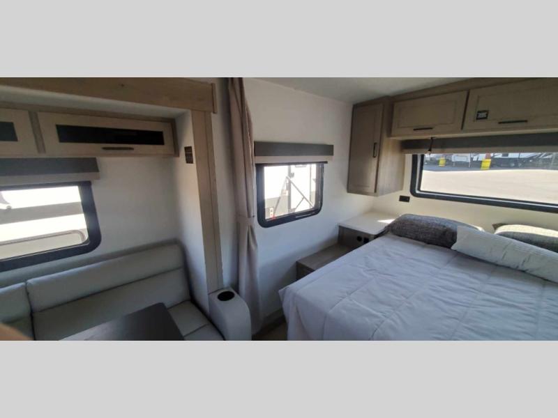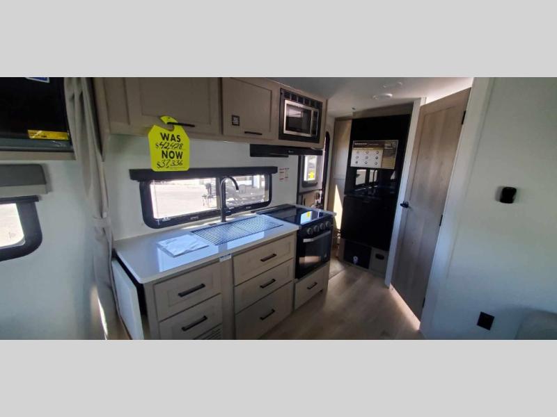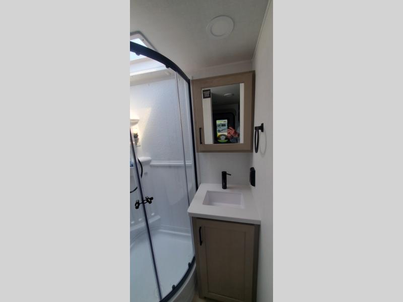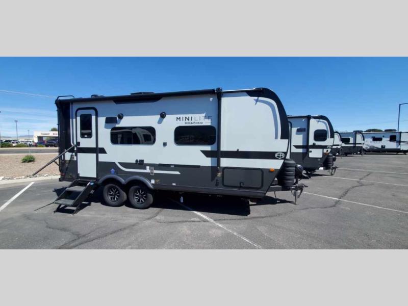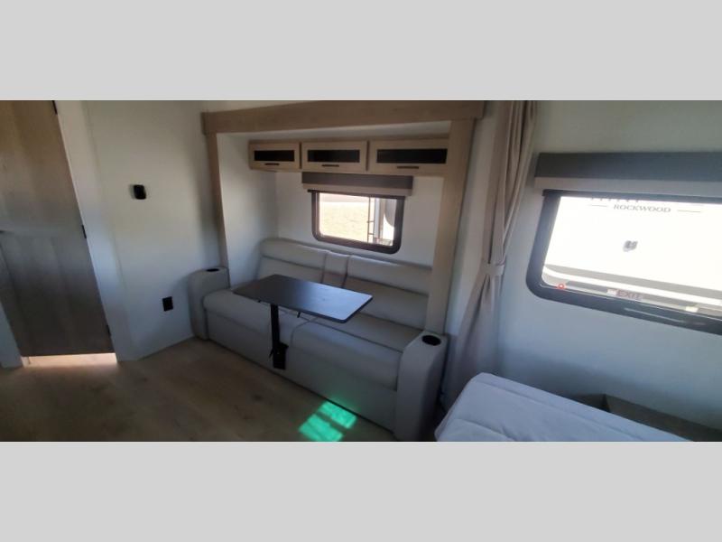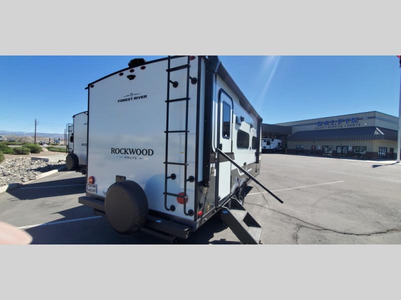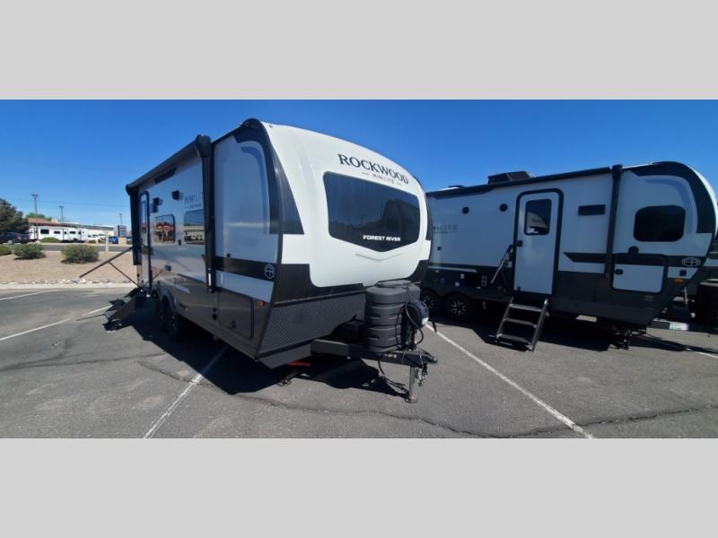 Each Rockwood Mini Lite travel trailer by Forest River is constructed with a fully laminated one-piece walkable roof, sleek frameless windows, and a six-sided full aluminum frame for strength and durability. The 12V thermostatically controlled heated tanks, plus radiant foil in the underbelly will allow you to camp well into the colder months, and the 200W roof solar panel will be perfect for a little off-gridding. Each model includes solid surface kitchen countertops, hidden hinge cabinet doors, roller shades, plus many more interior features. Having an AIR 360+ omnidirectional antenna with WiFi prep on board gives you the option to get some work done if it's needed, and the power tongue jack provides hassle-free set up, so you can enjoy more time relaxing!