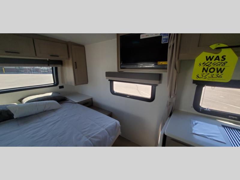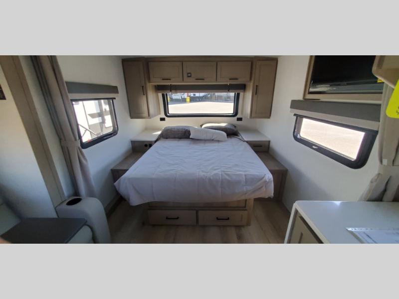 Wherever you decide to camp, you will love every minute in this cute couple's trailer. The sofa slide with a table will provide a place to relax, eat, and even sleep an extra guest if you have one, and the front RV queen bed includes a privacy curtain to enjoy your own space. There are dual bedroom wardrobes to keep your clothes tidy, and you'll find two pass-through storage compartments for your larger gear. An outside griddle with an LP hookup will allow you to make breakfast outdoors, and there is a three burner cooktop indoors if the weather isn't cooperating. Since there is a full bath on board you won't have to use the camp's facilities, and you can make it a movie night with the 32" TV in the main living area!