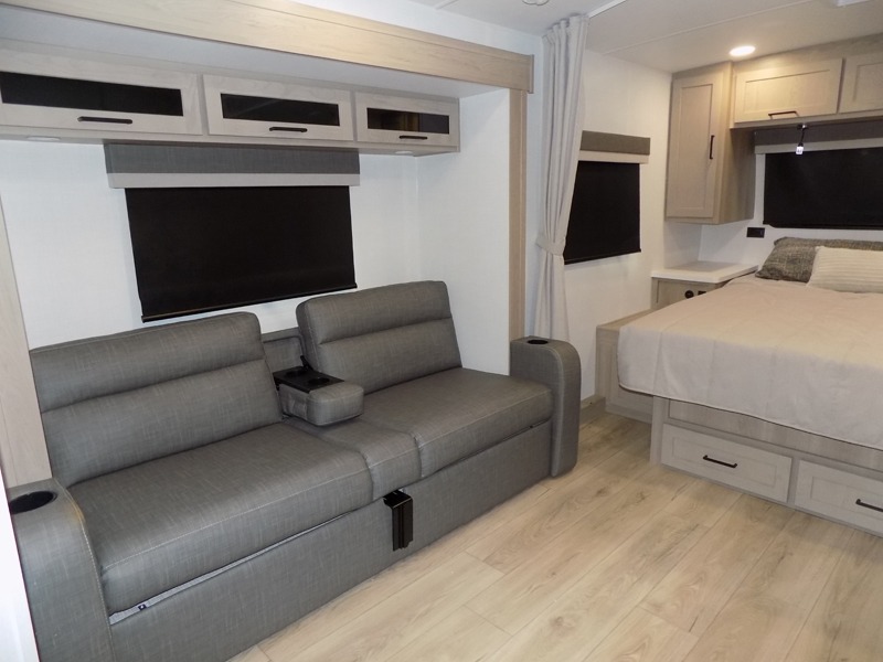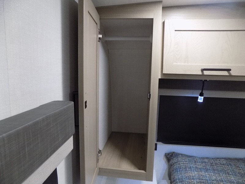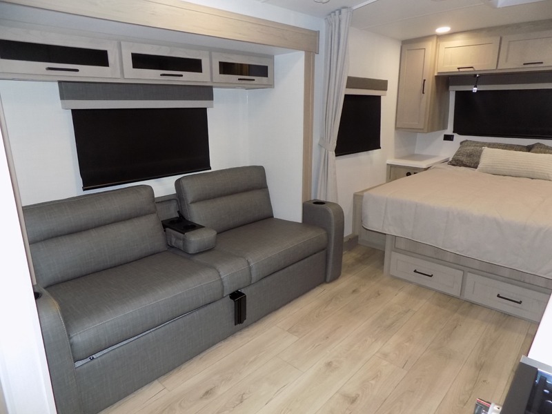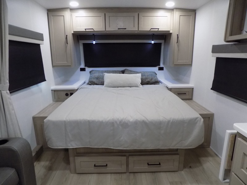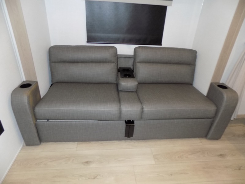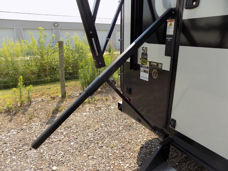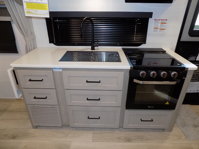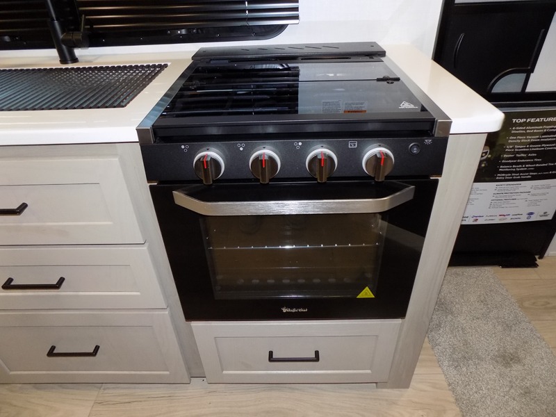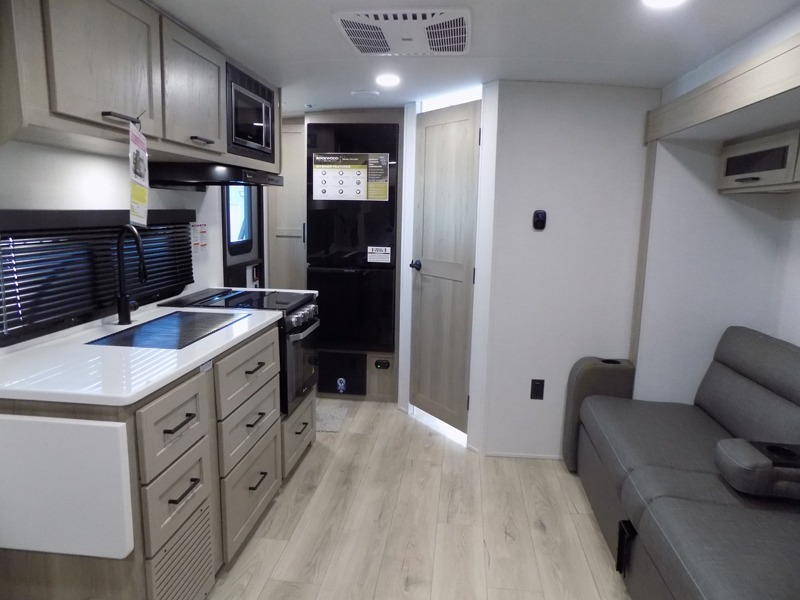 Wherever you decide to camp, you will love every minute in this cute couple's trailer. The sofa slide with a table will provide a place to relax, eat, and even sleep an extra guest if you have one, and the front RV queen bed includes a privacy curtain to enjoy your own space. There are dual bedroom wardrobes to keep your clothes tidy, and you'll find two pass-through storage compartments for your larger gear. An outside griddle with an LP hookup will allow you to make breakfast outdoors, and there is a three burner cooktop indoors if the weather isn't cooperating. Since there is a full bath on board you won't have to use the camp's facilities, and you can make it a movie night with the 32" TV in the main living area!