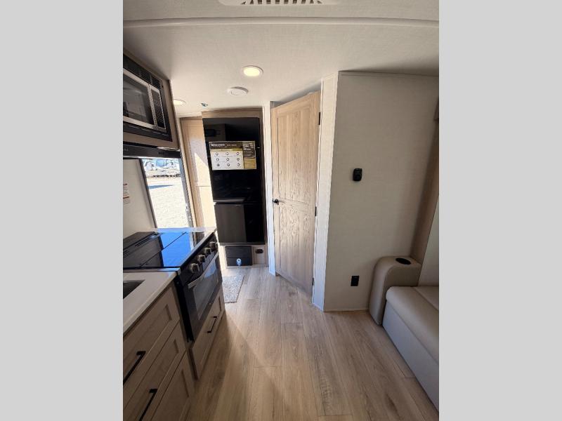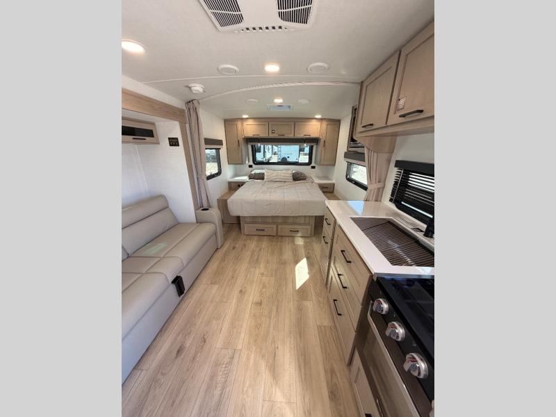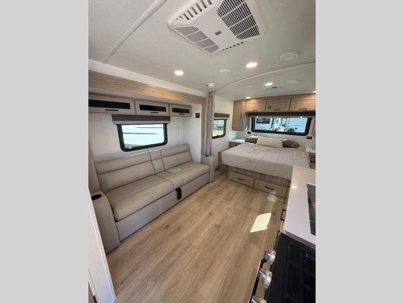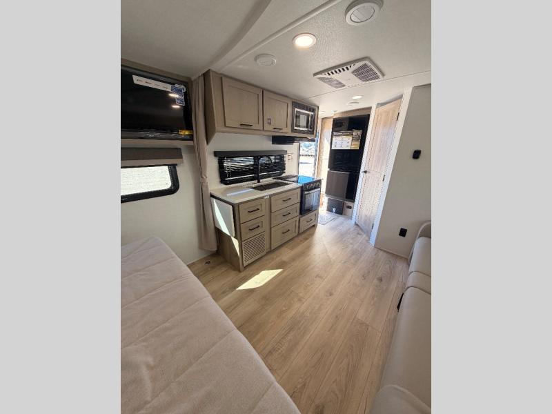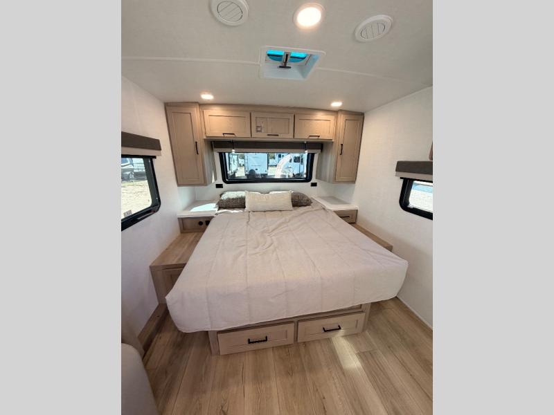Wherever you decide to camp, you will love every minute in this cute couple's trailer. The sofa slide with a table will provide a place to relax, eat, and even sleep an extra guest if you have one, and the front RV queen bed includes a privacy curtain to enjoy your own space. There are dual bedroom wardrobes to keep your clothes tidy, and you'll find two pass-through storage compartments for your larger gear. Since there is a full bath on board you won't have to use the camp's facilities, and you can make it a movie night with the TV in the main living area!