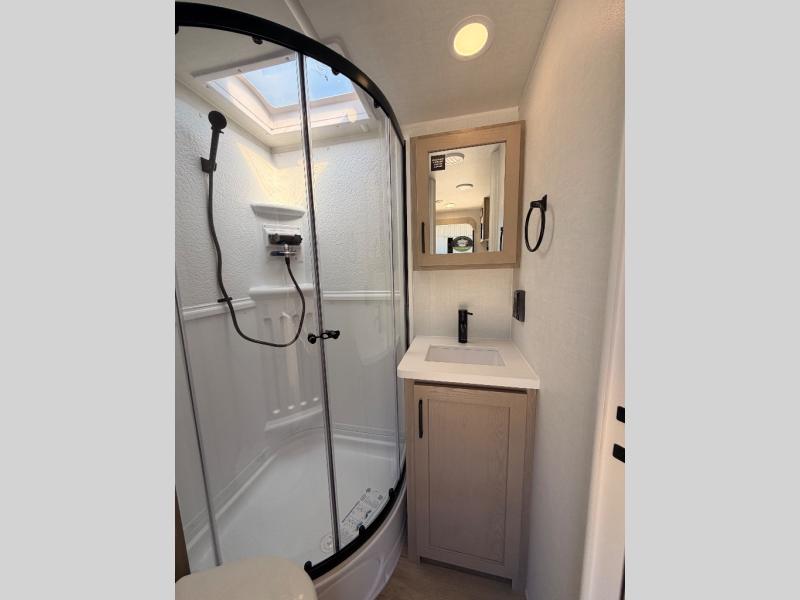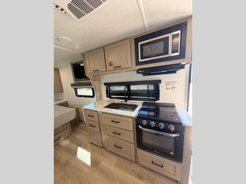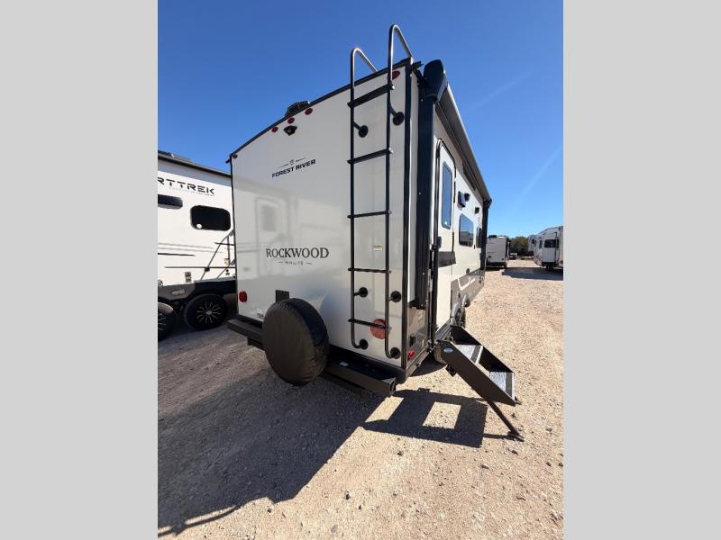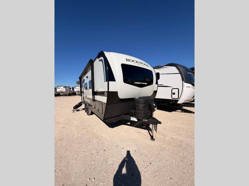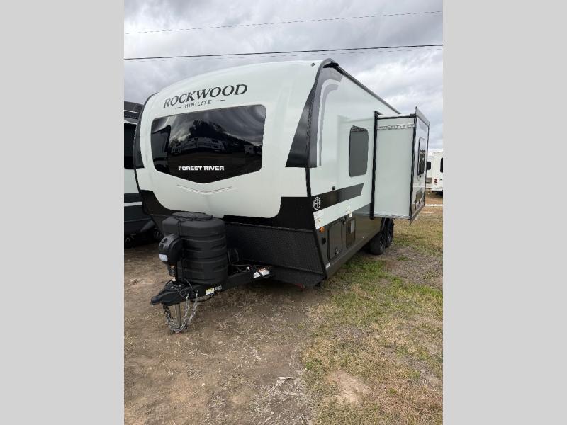Each Rockwood Mini Lite travel trailer by Forest River is constructed with a fully laminated one-piece walkable roof, sleek frameless windows, and a six-sided full aluminum frame for strength and durability. The 12V thermostatically controlled heated tanks, plus radiant foil in the underbelly will allow you to camp well into the colder months, and the 200W roof solar panel will be perfect for a little off-gridding. Each model includes solid surface kitchen countertops, hidden hinge cabinet doors, roller shades, plus many more interior features. Having an AIR 360+ omnidirectional antenna with WiFi prep on board gives you the option to get some work done if it's needed, and the power tongue jack provides hassle-free set up, so you can enjoy more time relaxing!