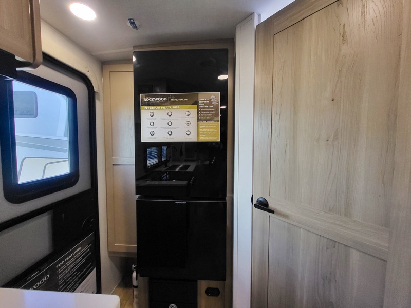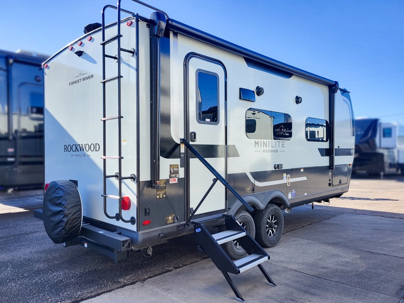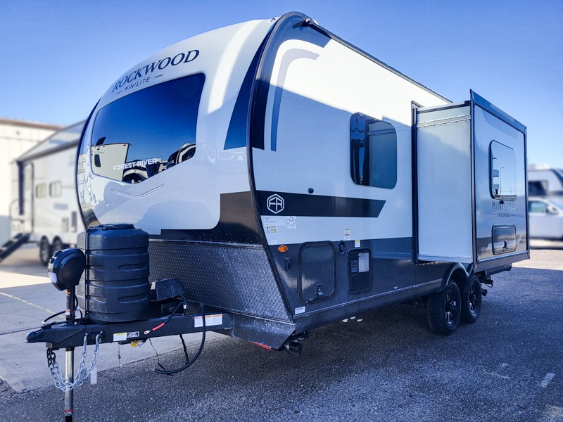 Each Rockwood Mini Lite travel trailer by Forest River is constructed with a fully laminated one-piece walkable roof, sleek frameless windows, and a six-sided full aluminum frame for strength and durability. The 12V thermostatically controlled heated tanks, plus radiant foil in the underbelly will allow you to camp well into the colder months, and the 200W roof solar panel will be perfect for a little off-gridding. Each model includes solid surface kitchen countertops, hidden hinge cabinet doors, roller shades, plus many more interior features. Having an AIR 360+ omnidirectional antenna with WiFi prep on board gives you the option to get some work done if it's needed, and the power tongue jack provides hassle-free set up, so you can enjoy more time relaxing!
