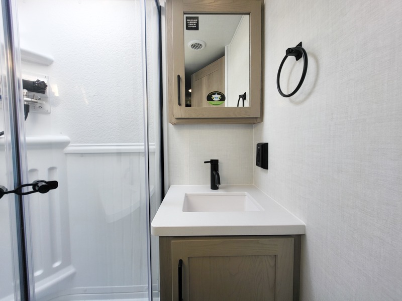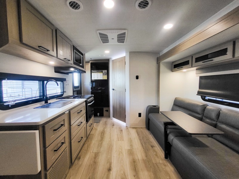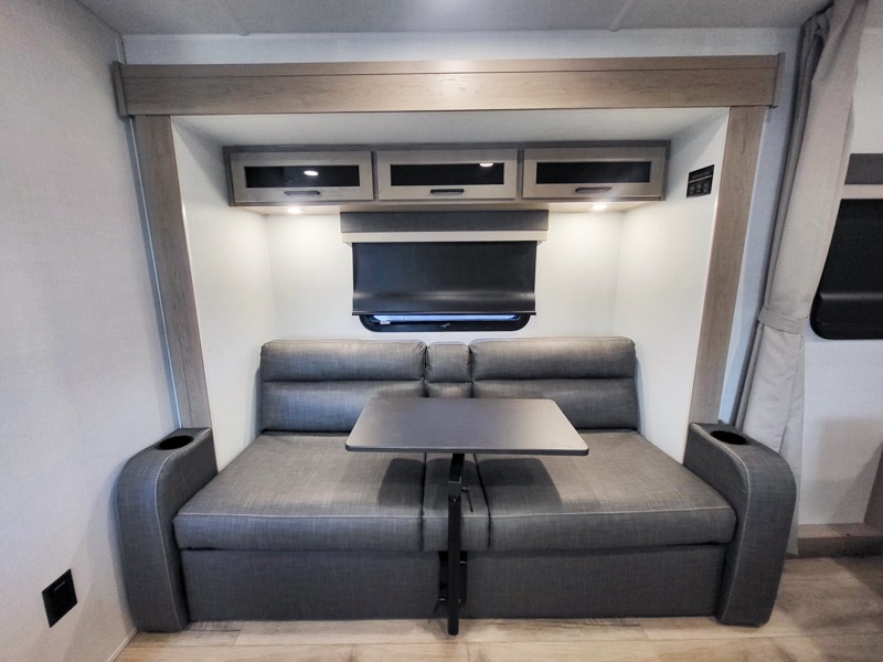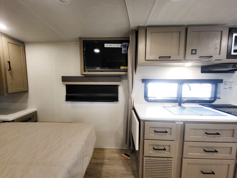 Wherever you decide to camp, you will love every minute in this cute couple's trailer. The sofa slide with a table will provide a place to relax, eat, and even sleep an extra guest if you have one, and the front RV queen bed includes a privacy curtain to enjoy your own space. There are dual bedroom wardrobes to keep your clothes tidy, and you'll find two pass-through storage compartments for your larger gear. Since there is a full bath on board you won't have to use the camp's facilities, and you can make it a movie night with the TV in the main living area!