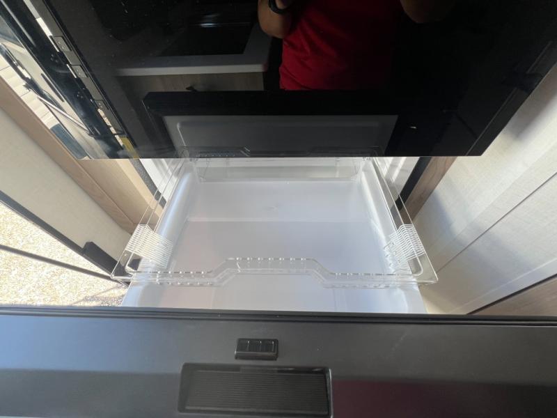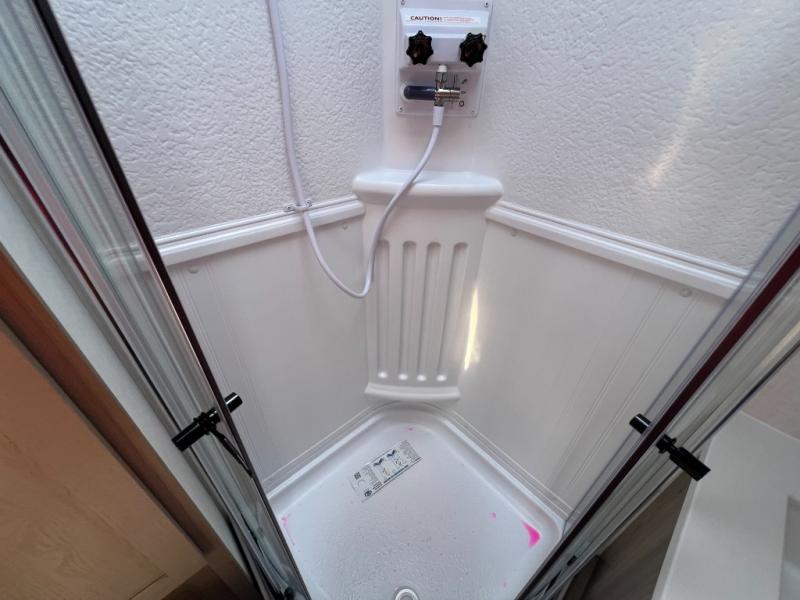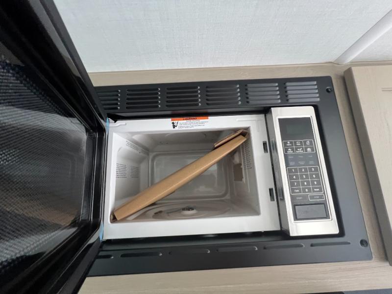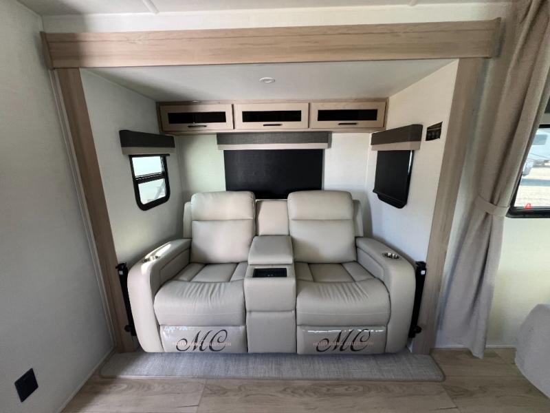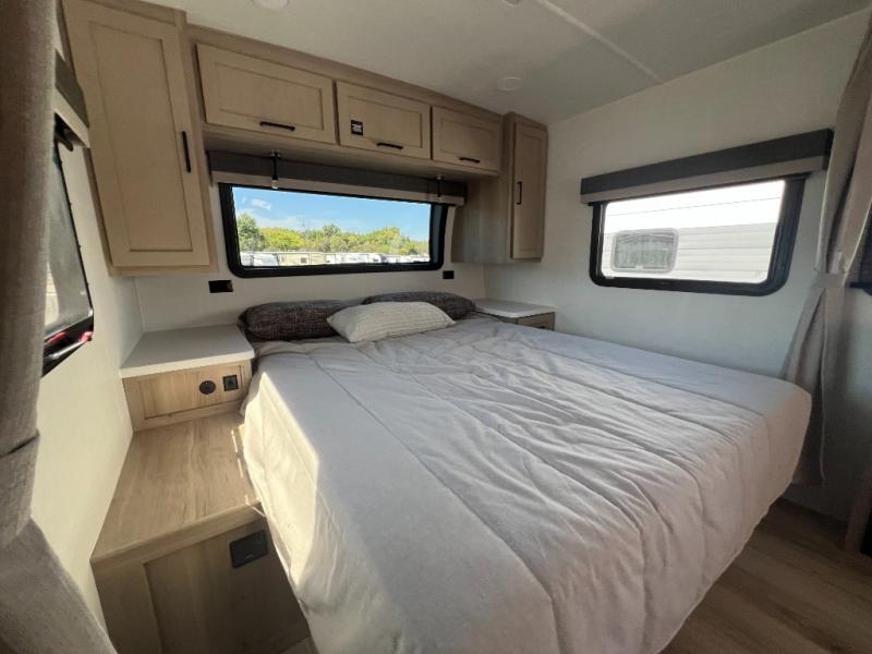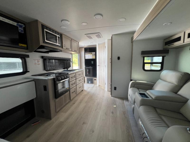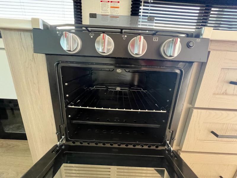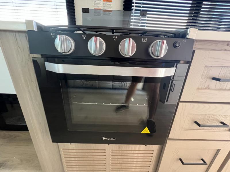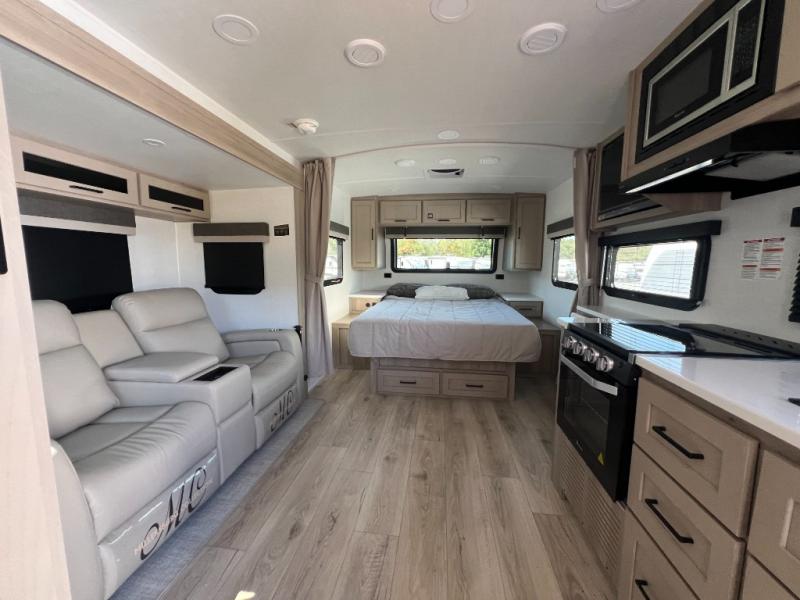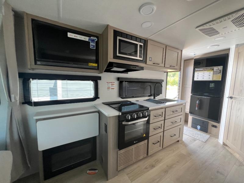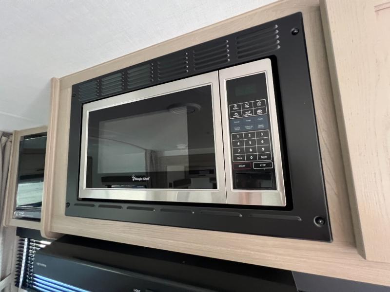 Enjoy the camping season with your spouse, friend, or significant other in this cozy travel trailer for two. Each morning, you can have your coffee on the 67" theater seats with a table within the slide out, then head outdoors to make pancakes on the outdoor griddle with an LP hookup. The interior kitchen includes a three burner cooktop, a microwave oven, plus a 12 volt refrigerator for perishables. An entertainment center with a fireplace will make your space feel more like home, and what's better than sleeping on your own queen bed with dual bedroom wardrobes for your clothes!?