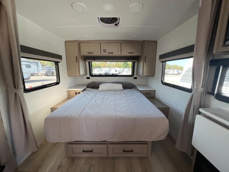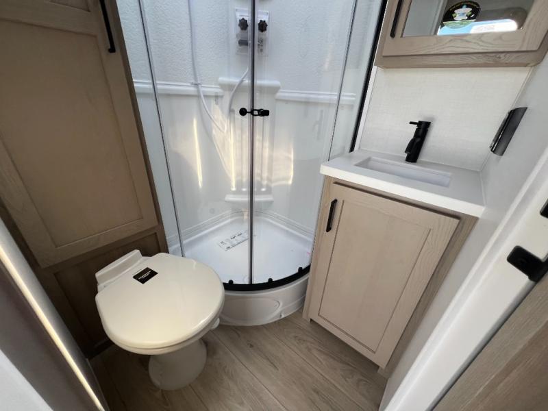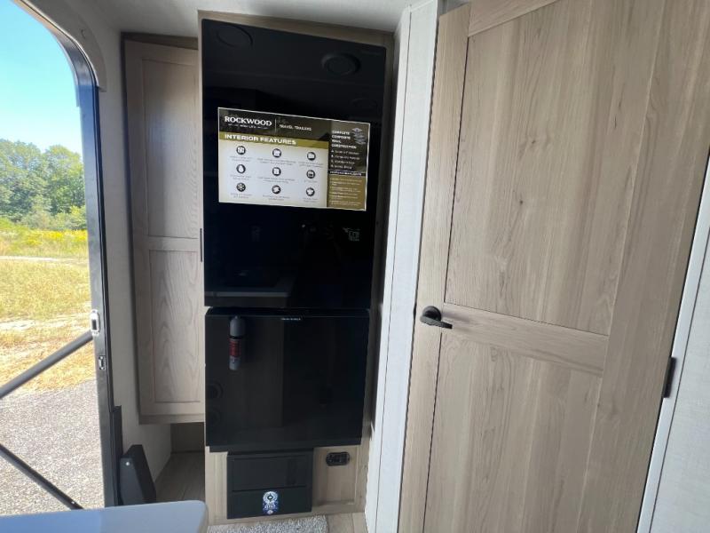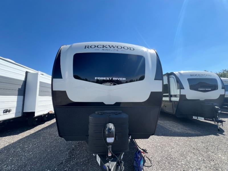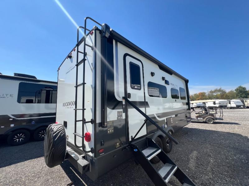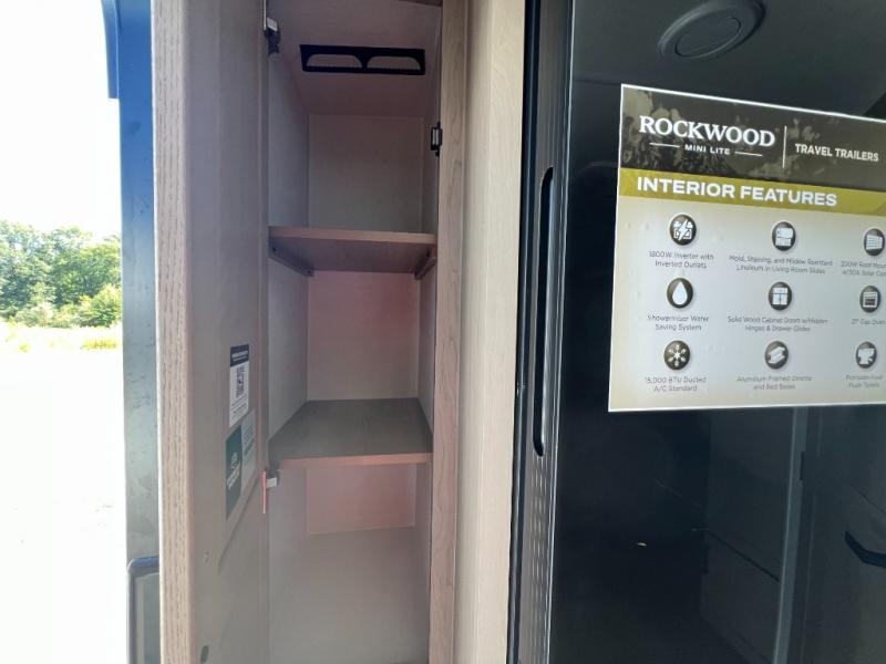 Each Rockwood Mini Lite travel trailer by Forest River is constructed with a fully laminated one-piece walkable roof, sleek frameless windows, and a six-sided full aluminum frame for strength and durability. The 12V thermostatically controlled heated tanks, plus radiant foil in the underbelly will allow you to camp well into the colder months, and the 200W roof solar panel will be perfect for a little off-gridding. Each model includes solid surface kitchen countertops, hidden hinge cabinet doors, roller shades, plus many more interior features. Having an AIR 360+ omnidirectional antenna with WiFi prep on board gives you the option to get some work done if it's needed, and the power tongue jack provides hassle-free set up, so you can enjoy more time relaxing!