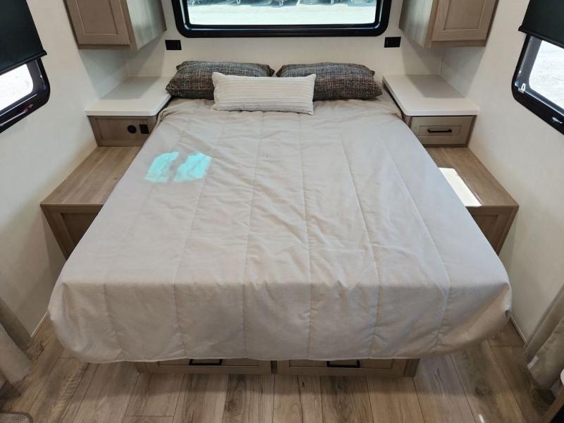 Enjoy the camping season with your spouse, friend, or significant other in this cozy travel trailer for two. Each morning, you can have your coffee on the 67" theater seats with a table within the slide out, then head outdoors to make pancakes on the outdoor griddle with an LP hookup. The interior kitchen includes a three burner cooktop, a microwave oven, plus a 12 volt refrigerator for perishables. An entertainment center with a fireplace will make your space feel more like home, and what's better than sleeping on your own queen bed with dual bedroom wardrobes for your clothes!?
