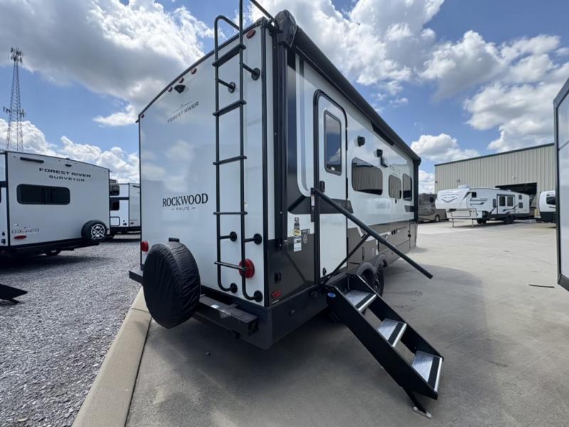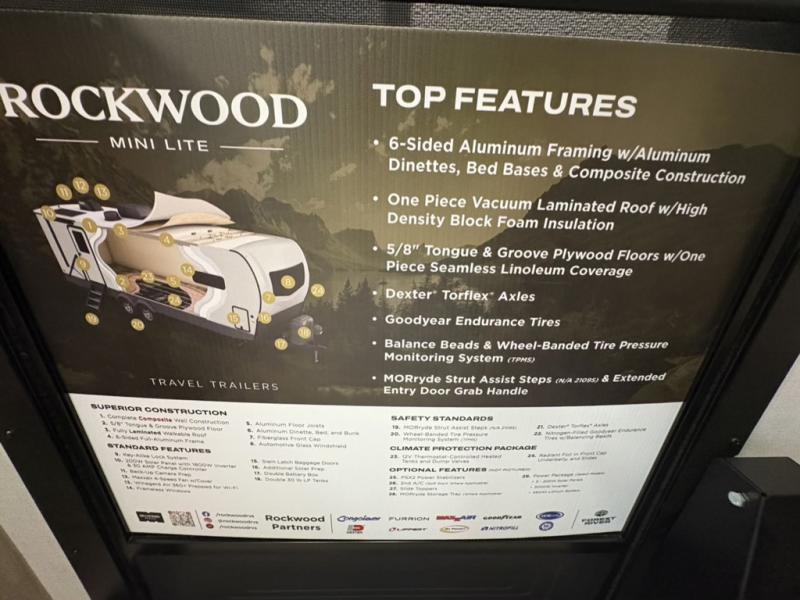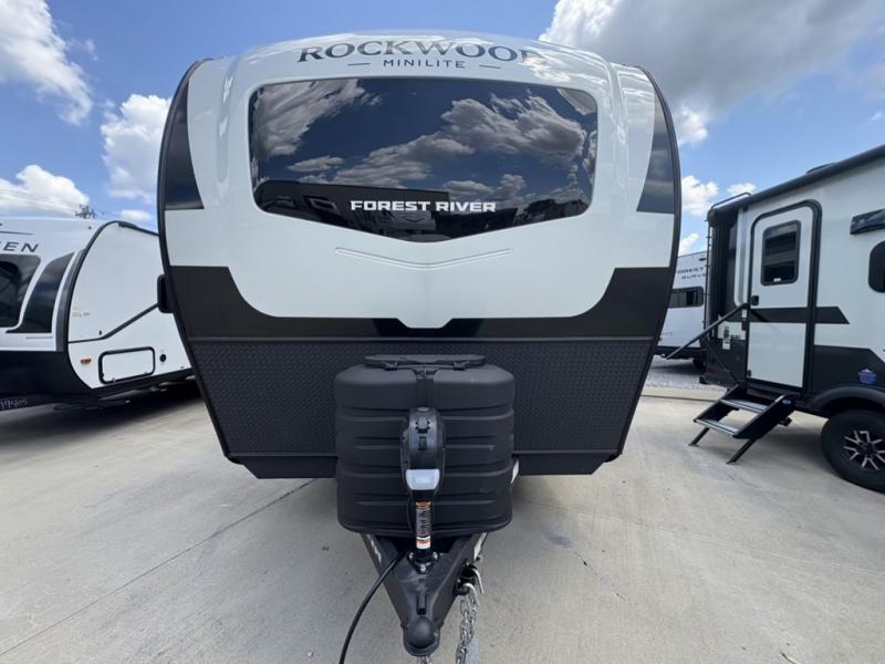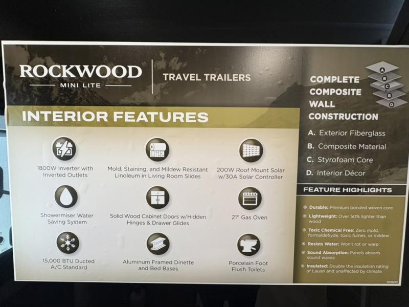 Each Rockwood Mini Lite travel trailer by Forest River is constructed with a fully laminated one-piece walkable roof, sleek frameless windows, and a six-sided full aluminum frame for strength and durability. The 12V thermostatically controlled heated tanks, plus radiant foil in the underbelly will allow you to camp well into the colder months, and the 200W roof solar panel will be perfect for a little off-gridding. Each model includes solid surface kitchen countertops, hidden hinge cabinet doors, roller shades, plus many more interior features. Having an AIR 360+ omnidirectional antenna with WiFi prep on board gives you the option to get some work done if it's needed, and the power tongue jack provides hassle-free set up, so you can enjoy more time relaxing!