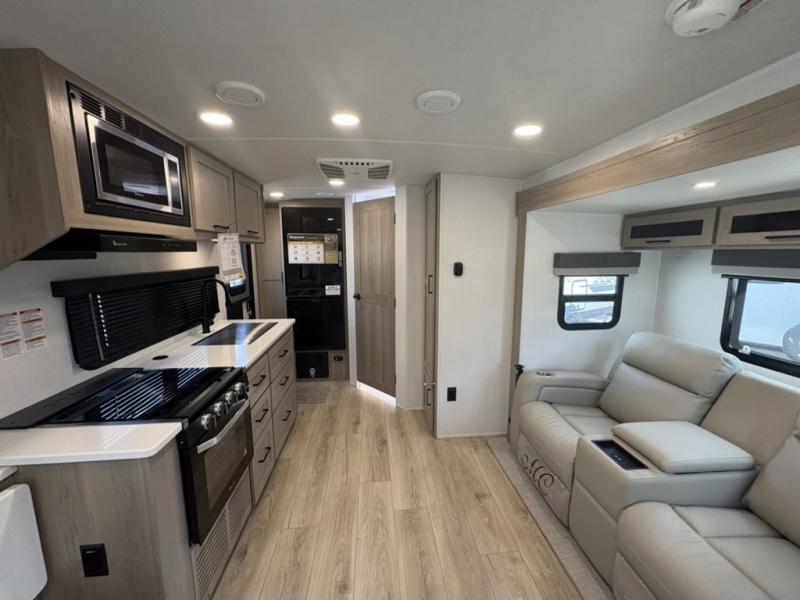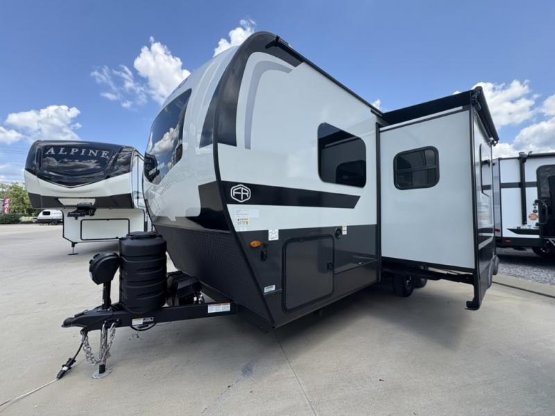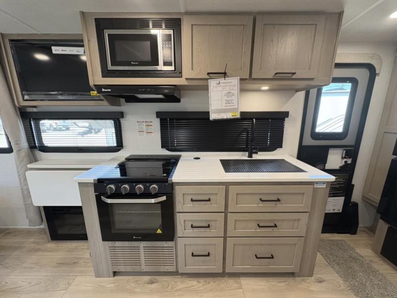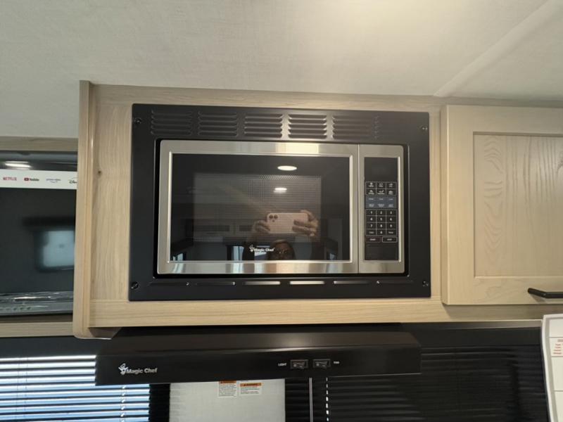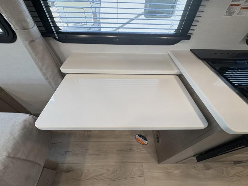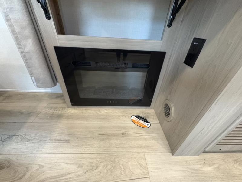 Enjoy the camping season with your spouse, friend, or significant other in this cozy travel trailer for two. Each morning, you can have your coffee on the 67" theater seats with a table within the slide out, then head outdoors to make pancakes on the outdoor griddle with an LP hookup. The interior kitchen includes a three burner cooktop, a microwave oven, plus a 12 volt refrigerator for perishables. An entertainment center with a fireplace will make your space feel more like home, and what's better than sleeping on your own queen bed with dual bedroom wardrobes for your clothes!?