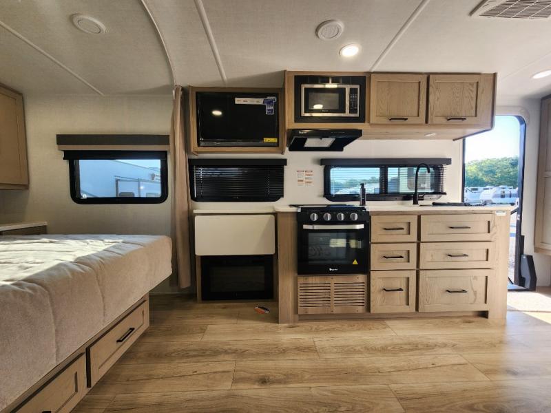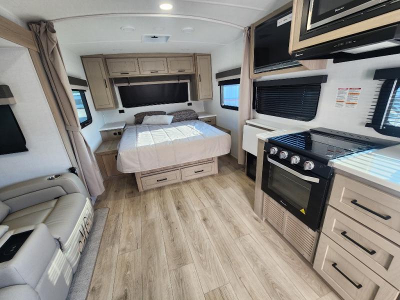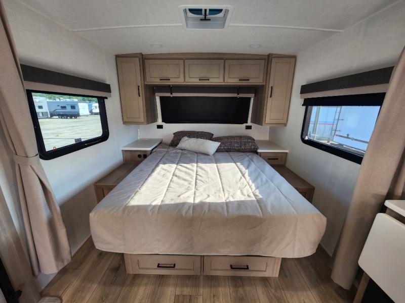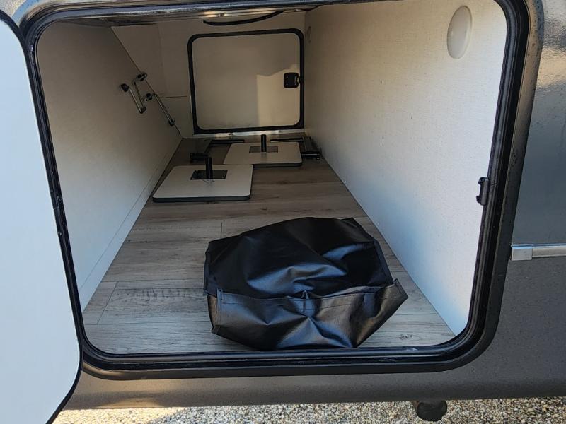 Enjoy the camping season with your spouse, friend, or significant other in this cozy travel trailer for two. Each morning, you can have your coffee on the 67" theater seats with a table within the slide out, then head outdoors to make pancakes on the outdoor griddle with an LP hookup. The interior kitchen includes a three burner cooktop, a microwave oven, plus a 12 volt refrigerator for perishables. An entertainment center with a fireplace will make your space feel more like home, and what's better than sleeping on your own queen bed with dual bedroom wardrobes for your clothes!?