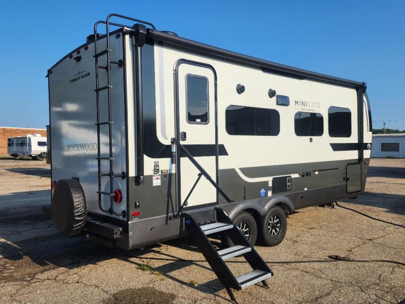 Each Rockwood Mini Lite travel trailer by Forest River is constructed with a fully laminated one-piece walkable roof, sleek frameless windows, and a six-sided full aluminum frame for strength and durability. The 12V thermostatically controlled heated tanks, plus radiant foil in the underbelly will allow you to camp well into the colder months, and the 200W roof solar panel will be perfect for a little off-gridding. Each model includes solid surface kitchen countertops, hidden hinge cabinet doors, roller shades, plus many more interior features. Having an AIR 360+ omnidirectional antenna with WiFi prep on board gives you the option to get some work done if it's needed, and the power tongue jack provides hassle-free set up, so you can enjoy more time relaxing!