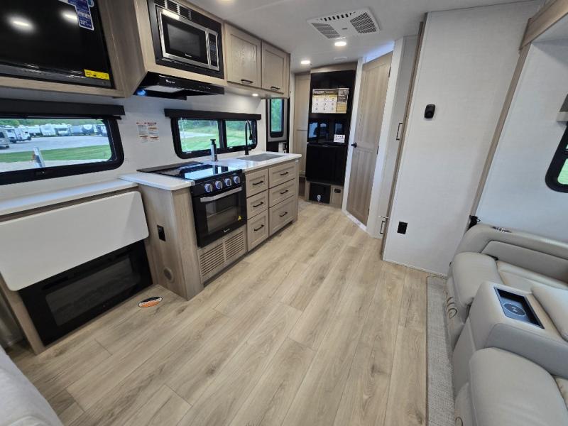 Enjoy the camping season with your spouse, friend, or significant other in this cozy travel trailer for two. Each morning, you can have your coffee on the 67" theater seats with a table within the slide out, then head outdoors to make pancakes on the outdoor griddle with an LP hookup. The interior kitchen includes a three burner cooktop, a microwave oven, plus a 12 volt refrigerator for perishables. An entertainment center with a fireplace will make your space feel more like home, and what's better than sleeping on your own queen bed with dual bedroom wardrobes for your clothes!?