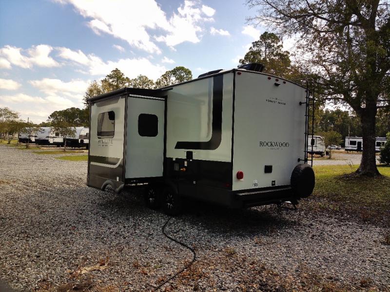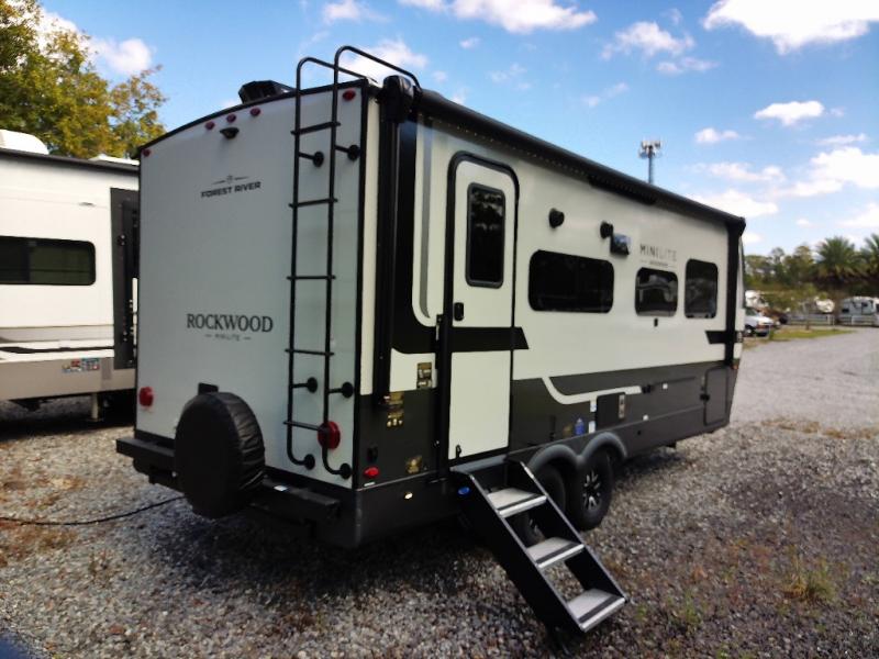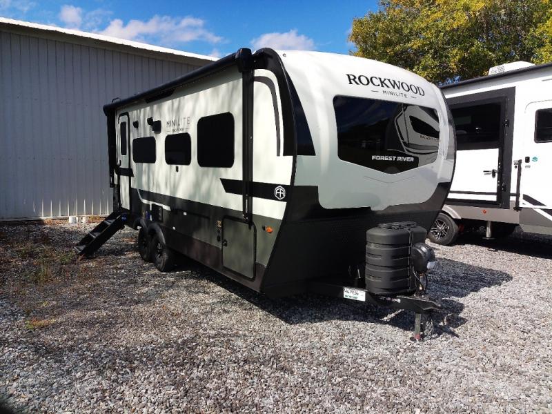 Each Rockwood Mini Lite travel trailer by Forest River is constructed with a fully laminated one-piece walkable roof, sleek frameless windows, and a six-sided full aluminum frame for strength and durability. The 12V thermostatically controlled heated tanks, plus radiant foil in the underbelly will allow you to camp well into the colder months, and the 200W roof solar panel will be perfect for a little off-gridding. Each model includes solid surface kitchen countertops, hidden hinge cabinet doors, roller shades, plus many more interior features. Having an AIR 360+ omnidirectional antenna with WiFi prep on board gives you the option to get some work done if it's needed, and the power tongue jack provides hassle-free set up, so you can enjoy more time relaxing!