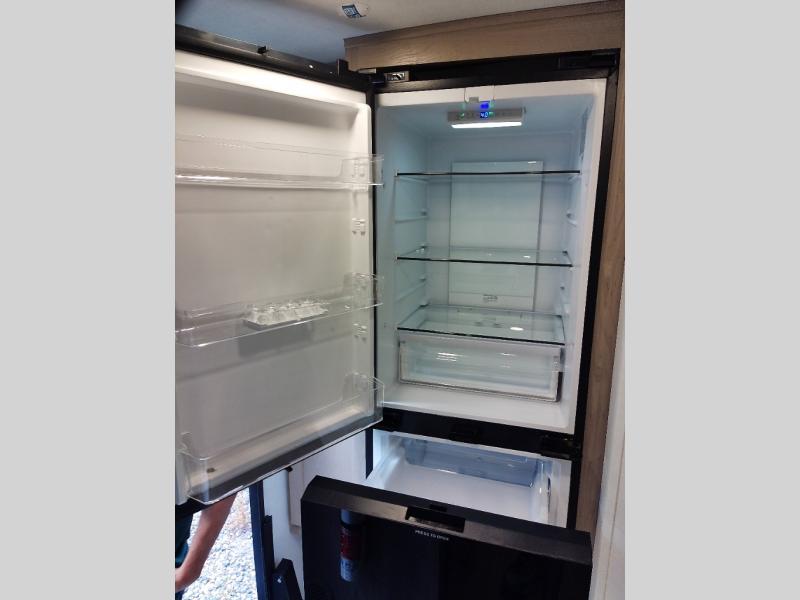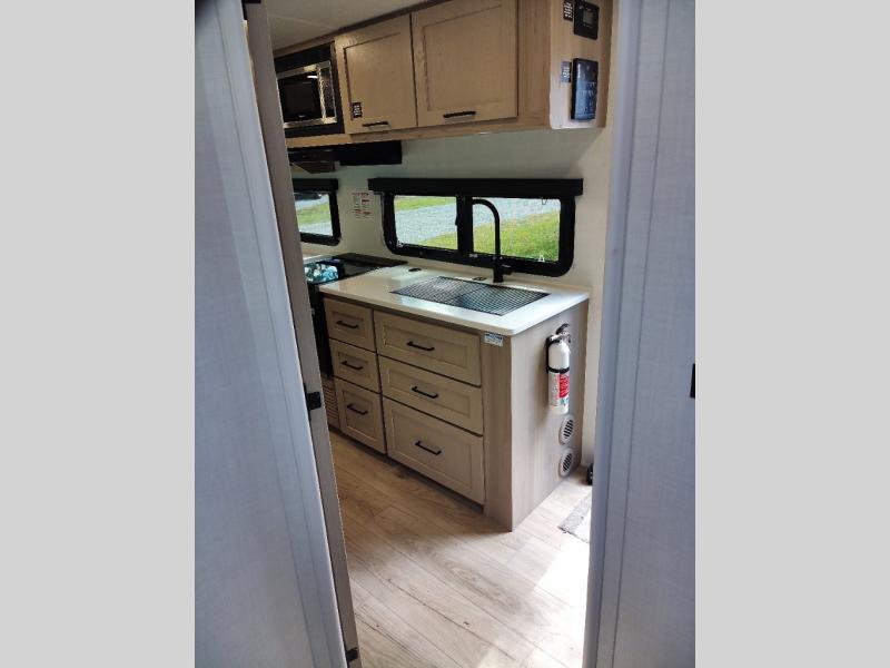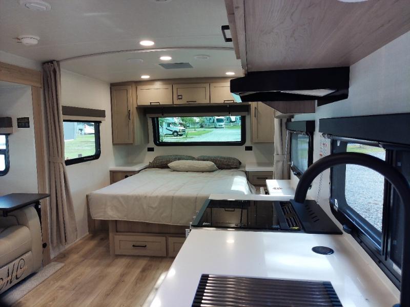 Enjoy the camping season with your spouse, friend, or significant other in this cozy travel trailer for two. Each morning, you can have your coffee on the 67" theater seats with a table within the slide out, then head outdoors to make pancakes on the outdoor griddle with an LP hookup. The interior kitchen includes a three burner cooktop, a microwave oven, plus a 12 volt refrigerator for perishables. An entertainment center with a fireplace will make your space feel more like home, and what's better than sleeping on your own queen bed with dual bedroom wardrobes for your clothes!?