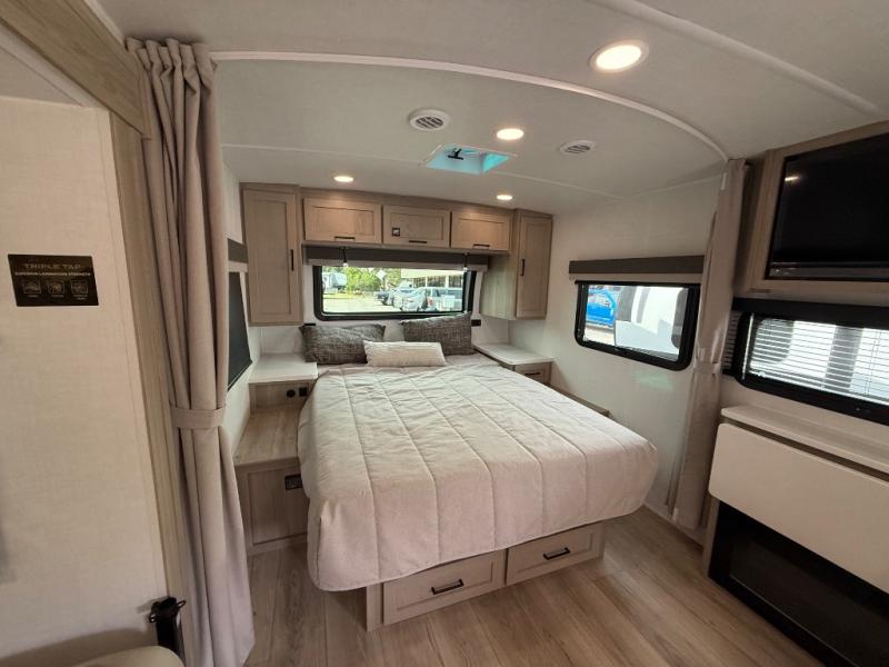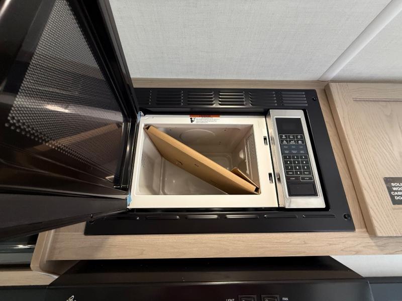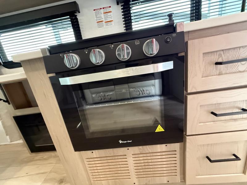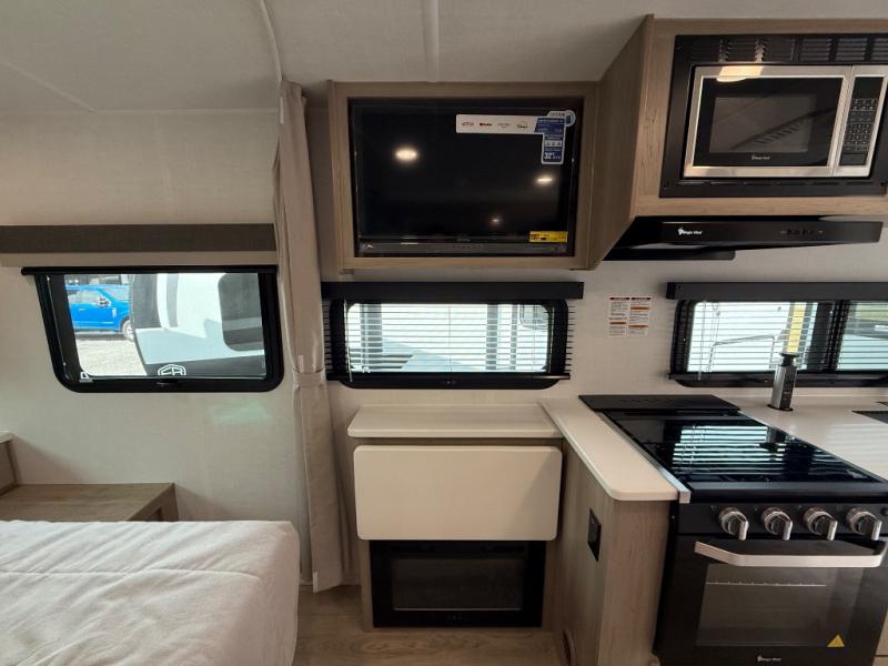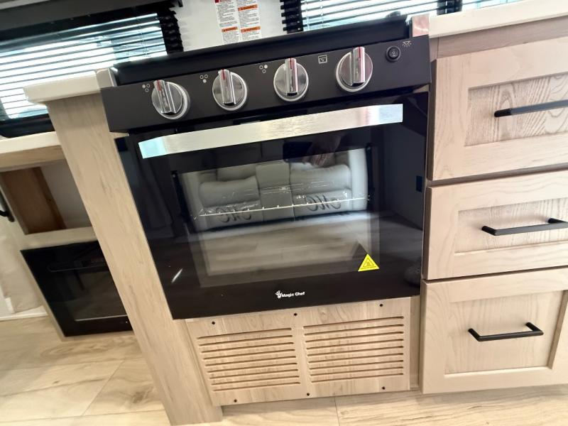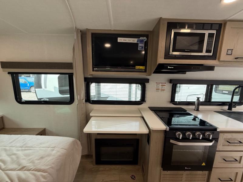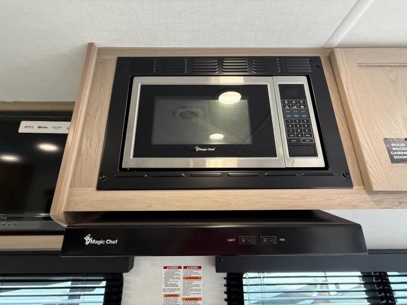 Enjoy the camping season with your spouse, friend, or significant other in this cozy travel trailer for two. Each morning, you can have your coffee on the 67" theater seats with a table within the slide out, then head outdoors to make pancakes on the outdoor griddle with an LP hookup. The interior kitchen includes a three burner cooktop, a microwave oven, plus a 12 volt refrigerator for perishables. An entertainment center with a fireplace will make your space feel more like home, and what's better than sleeping on your own queen bed with dual bedroom wardrobes for your clothes!?
